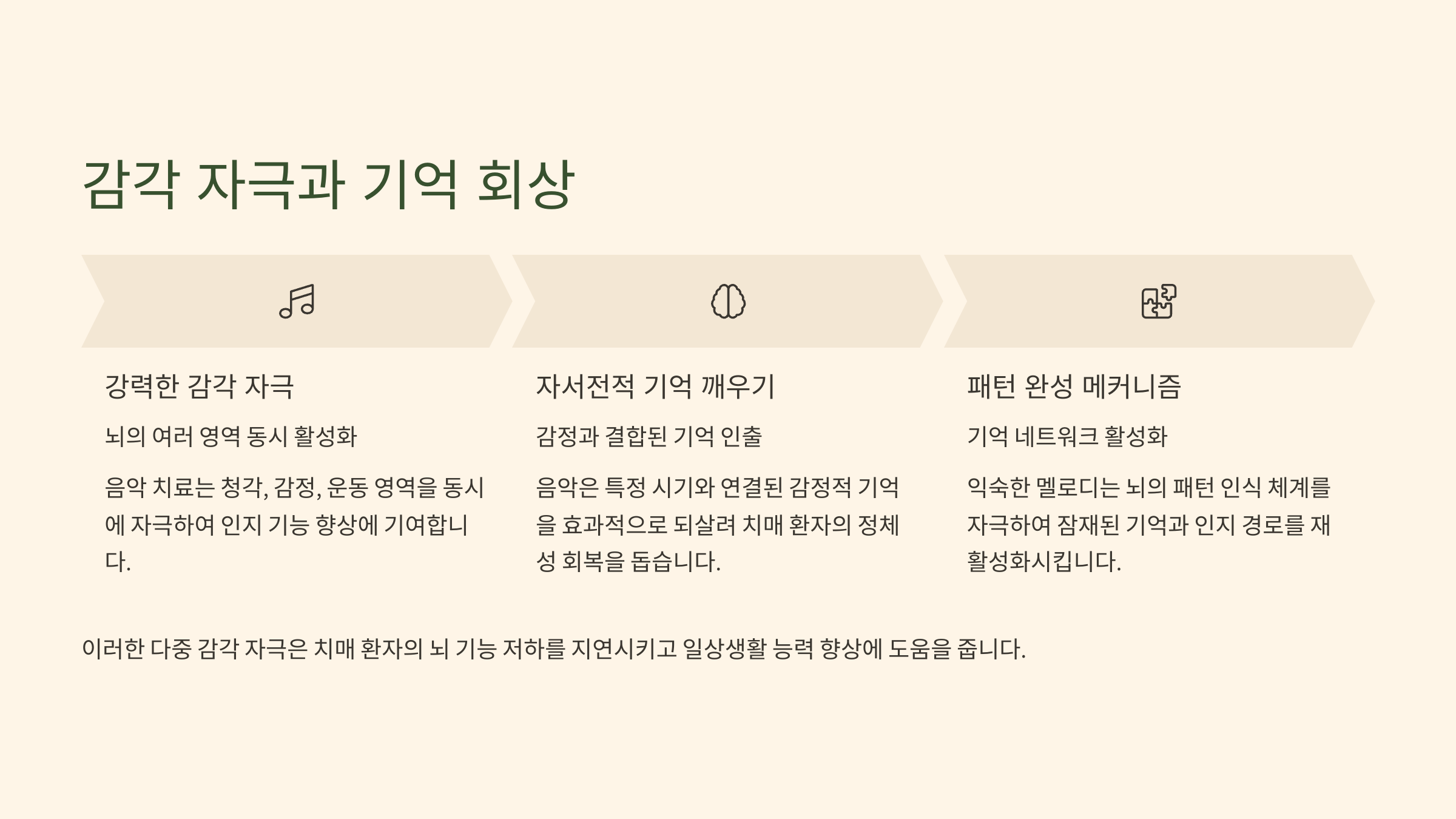 음악은 뇌에 보내는 가장 강력하고 복합적인 '감각 자극' 중 하나입니다. 익숙한 멜로디는 청각을 통해 뇌의 여러 영역을 동시에 활성화시키며, 특히 다른 방법으로는 접근하기 힘든 오래된 기억을 되살리는 데 매우 효과적입니다.