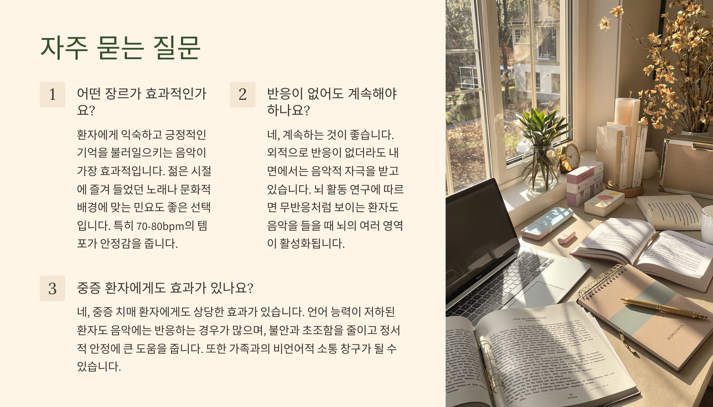 A4: 네, 효과가 있습니다. 중증 치매 환자의 경우 인지 기능 개선보다는 정서적 안정, 불안감 및 초조함 감소, 보호자와의 비언어적 교감 형성 등에 더 큰 효과를 볼 수 있습니다. 언어적 소통이 어려운 환자에게 음악은 마지막까지 남는 강력한 소통의 도구가 될 수 있습니다.