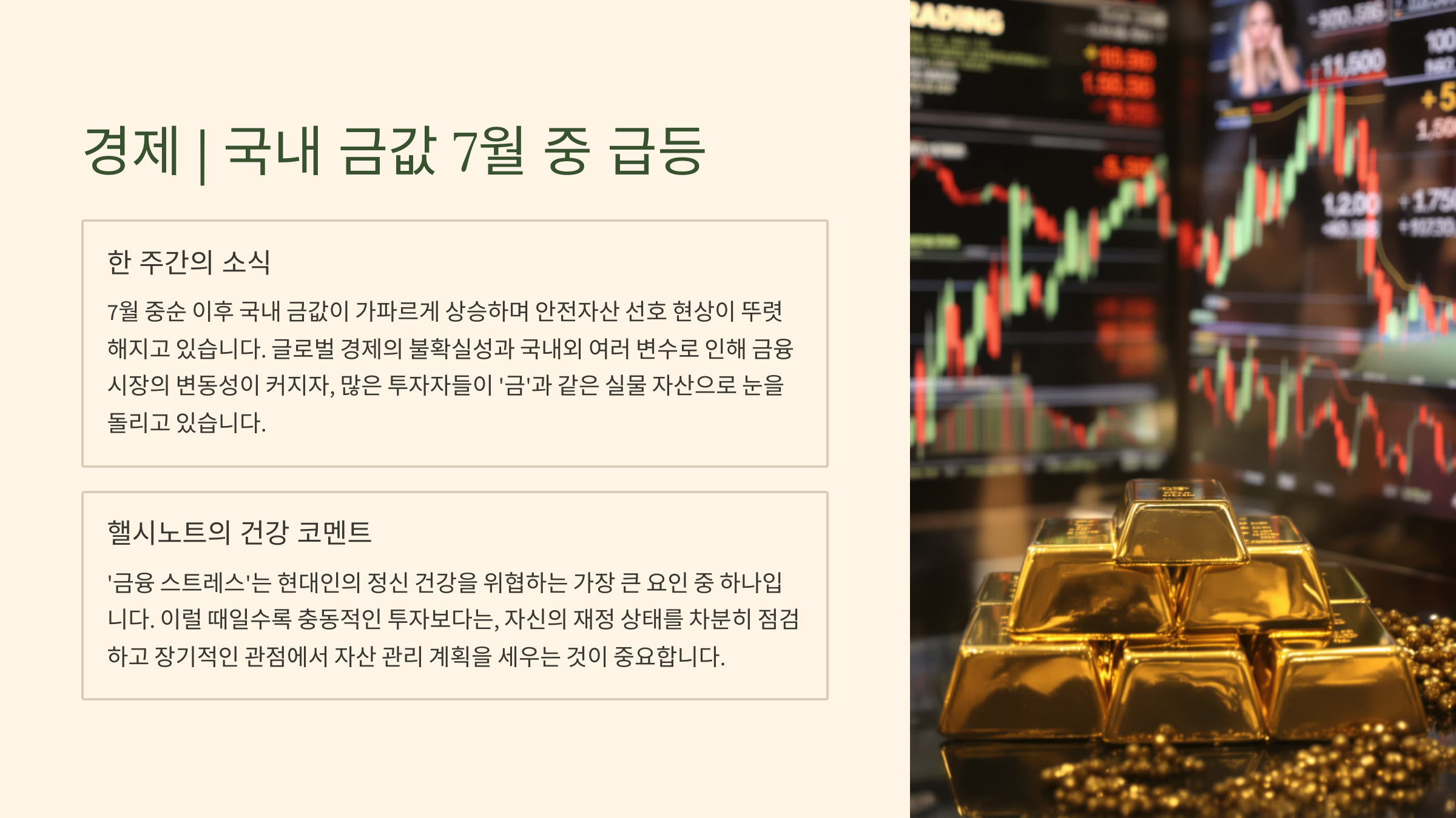 7월 중순 이후 국내 금값이 가파르게 상승하며 안전자산 선호 현상이 뚜렷해지고 있습니다. 글로벌 경제의 불확실성과 국내외 여러 변수로 인해 금융 시장의 변동성이 커지자, 많은 투자자들이 '금'과 같은 실물 자산으로 눈을 돌리고 있습니다.