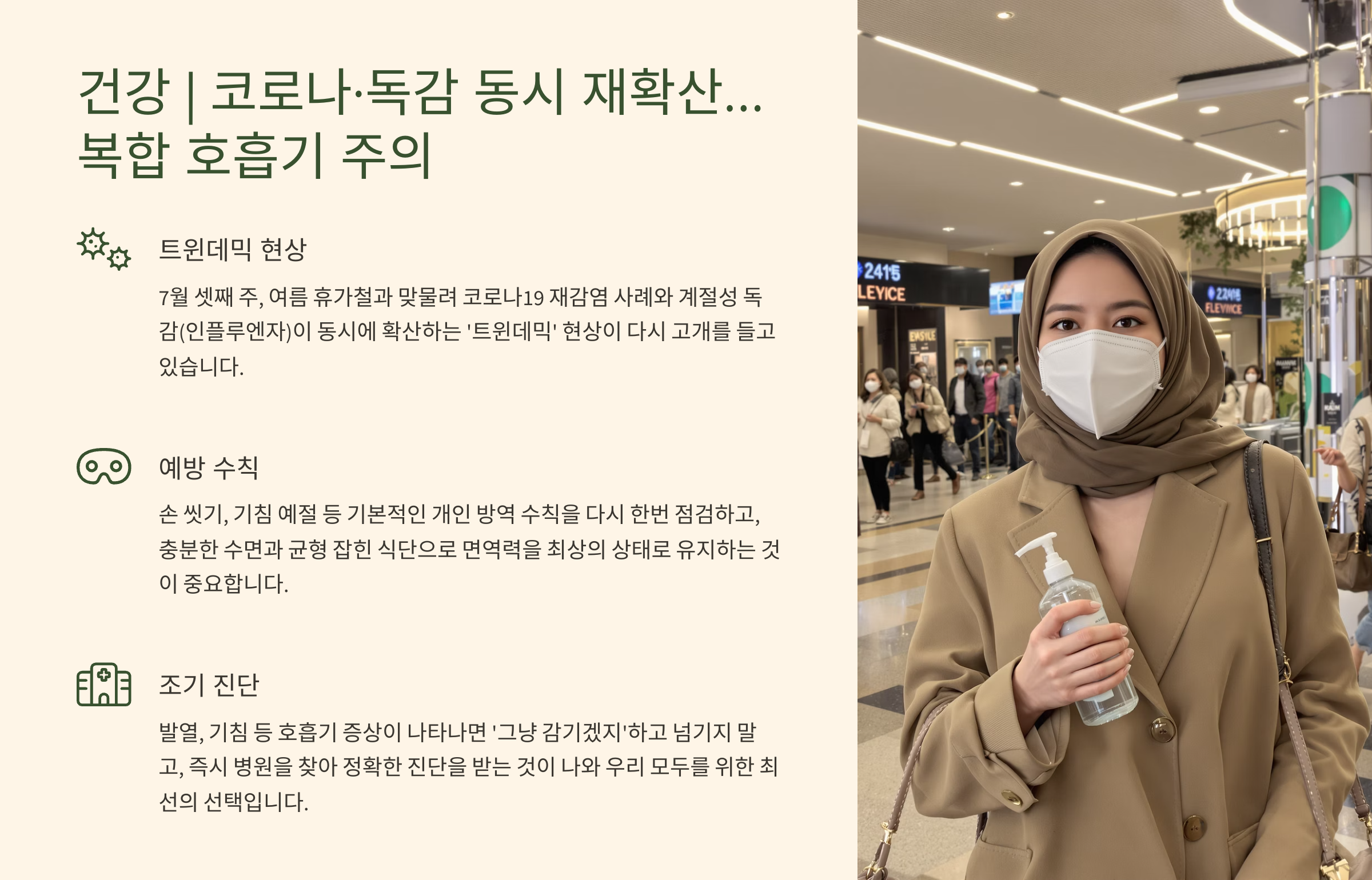 7월 셋째 주, 여름 휴가철과 맞물려 코로나19 재감염 사례와 계절성 독감(인플루엔자)이 동시에 확산하는 '트윈데믹' 현상이 다시 고개를 들고 있습니다. 특히 두 가지 바이러스에 동시에 감염될 경우 증상이 더 심하게 나타날 수 있어 각별한 주의가 요구됩니다.