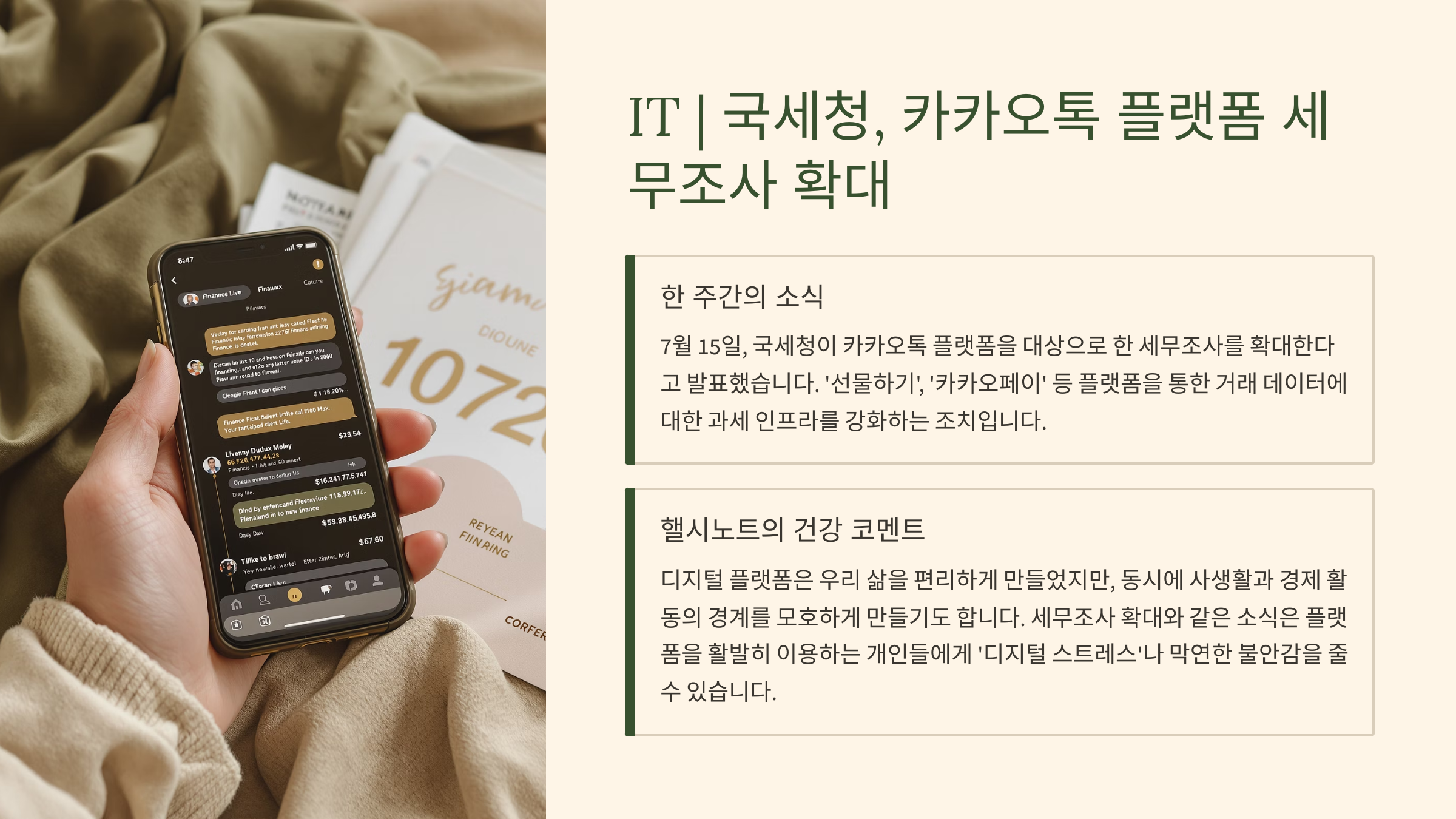 7월 15일, 국세청이 카카오톡 플랫폼을 대상으로 한 세무조사를 확대한다고 발표했습니다. '선물하기', '카카오페이' 등 플랫폼을 통한 거래 데이터에 대한 과세 인프라를 강화하는 조치로, 디지털 경제의 투명성을 높이려는 움직임으로 해석됩니다.