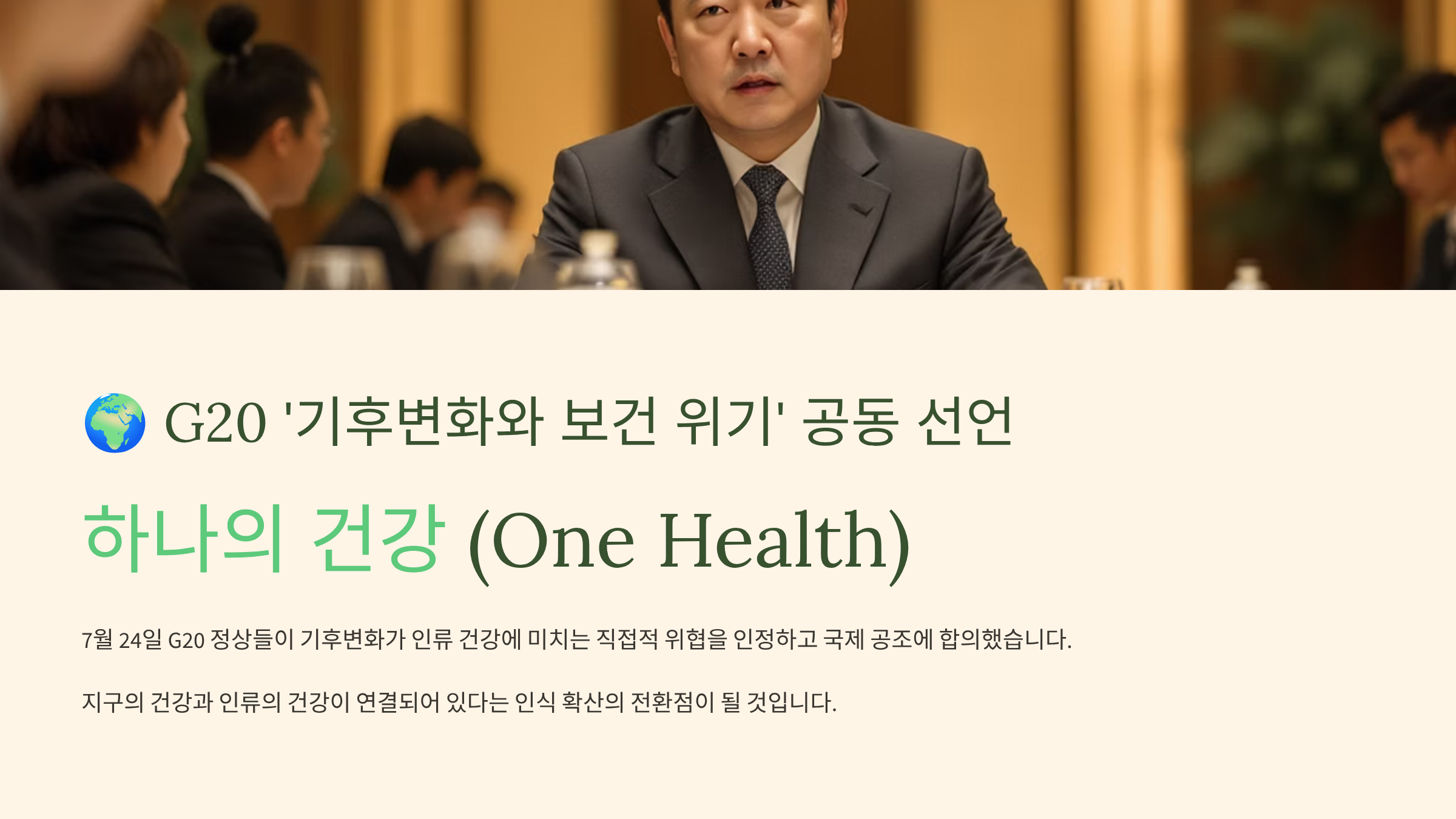 지난 7월 24일, G20 정상들이 '기후변화가 초래하는 보건 위기'에 공동으로 대응하자는 역사적인 선언문을 채택했습니다. 각국 정상들은 폭염, 신종 감염병 등 기후 변화가 인류의 건강에 미치는 직접적인 위협을 인정하고, 이를 해결하기 위한 국제 공조와 기금 마련에 합의했습니다.