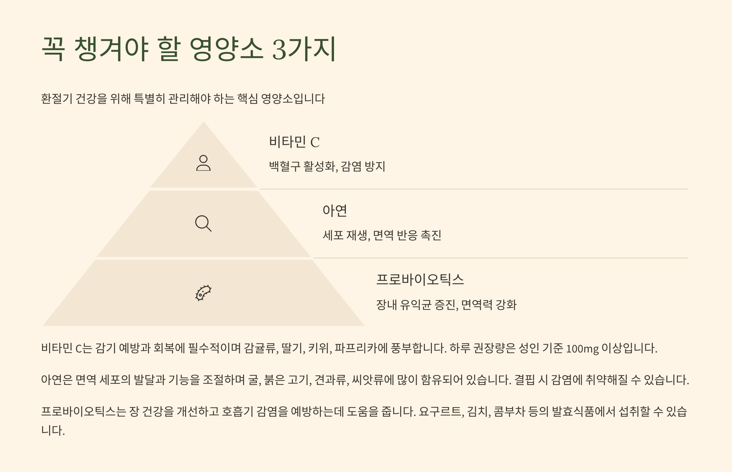 A: 비타민 C 외에도 아연, 수분 섭취, 균형식이 필요합니다. - Q3. 아이들 환절기 식단은 어떻게 해야 하나요?