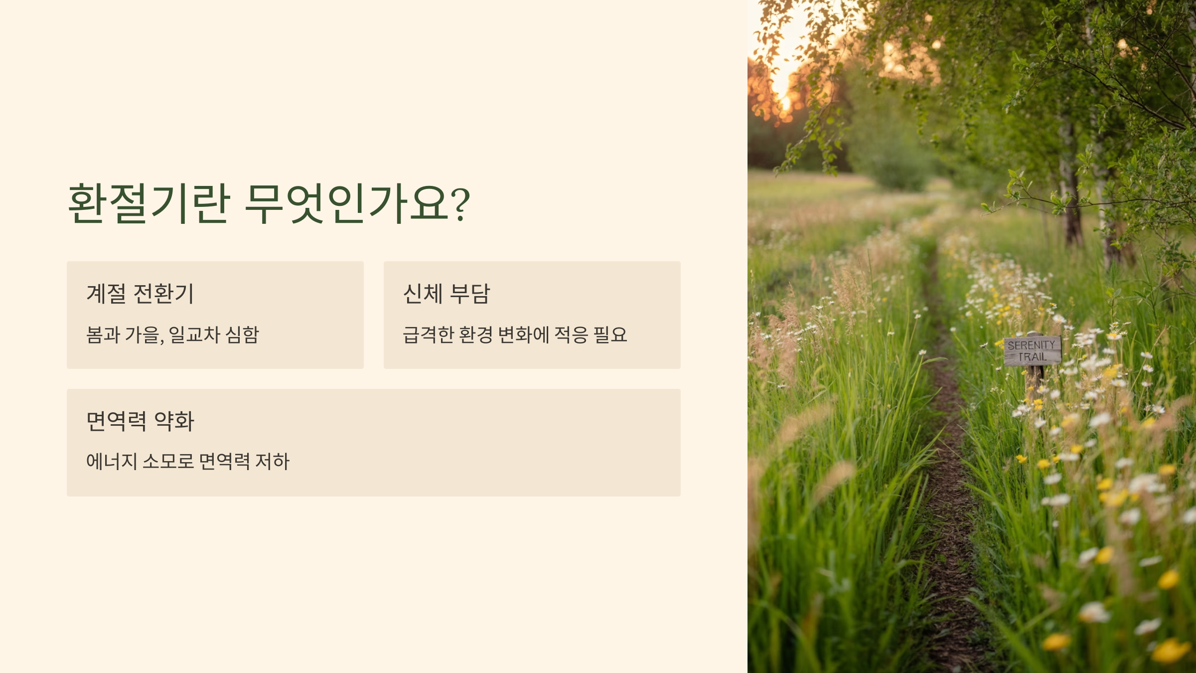 환절기는 계절이 바뀌는 시기로, 일교차가 심하고 습도나 기온 변화가 급격하게 발생하는 시기입니다. 봄과 가을에 주로 해당하며, 우리 몸은 이런 급격한 환경 변화에 적응하느라 에너지를 소모하고 면역력이 약화되기 쉽습니다. 환절기를 잘 넘기는 것은 곧 1년 건강의 기초를 다지는 일이라고 할 수 있습니다.