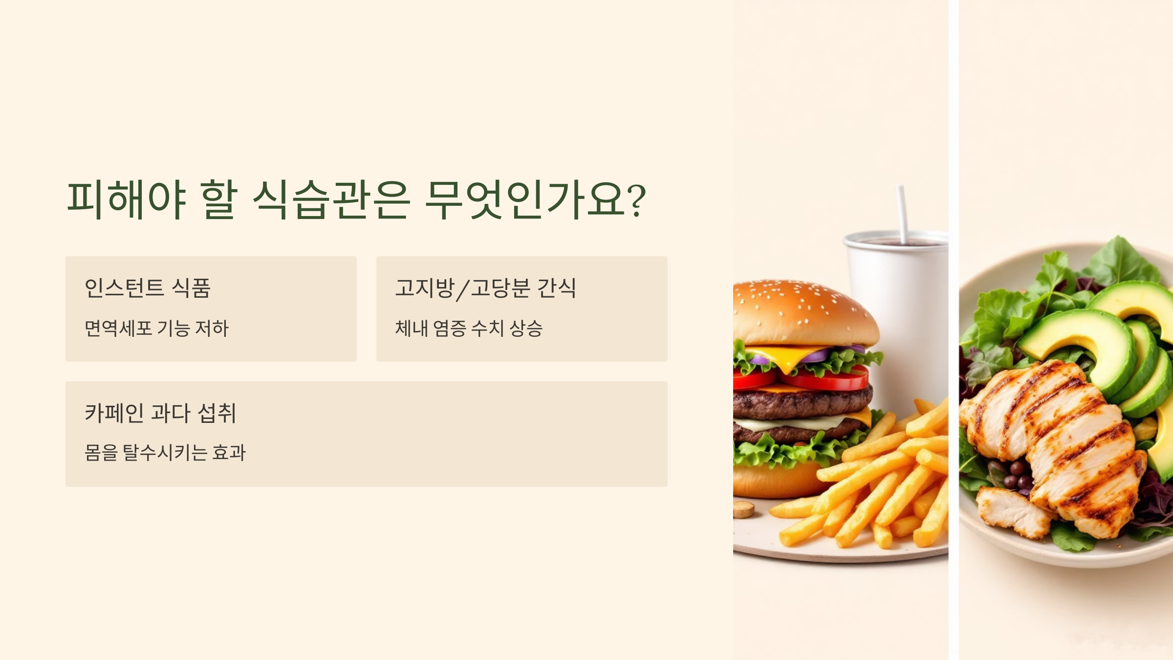 인스턴트 식품, 고지방/고당분 간식, 카페인 과다 섭취는 환절기에 특히 피해야 합니다. 이런 식품은 몸을 탈수시키고, 면역세포 기능을 저하시키며, 체내 염증 수치를 높일 수 있습니다.