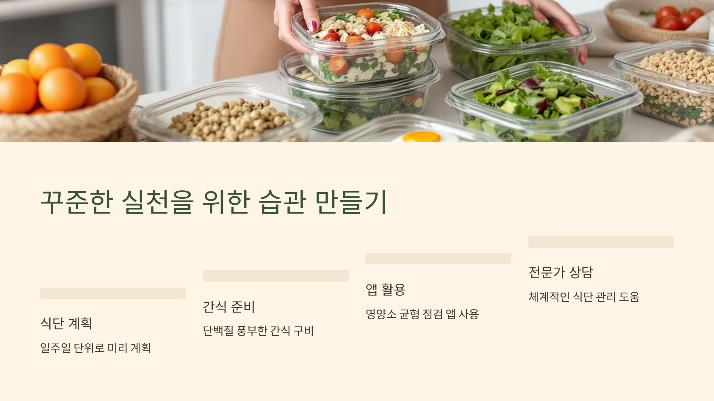 일주일에 한 번 식단을 미리 계획하고, 단백질이 풍부한 간식을 준비해두는 것이 좋습니다. 영양소 균형을 점검할 수 있는 앱을 활용하거나 전문가 상담을 병행하면 더욱 체계적인 식단 관리가 가능합니다.