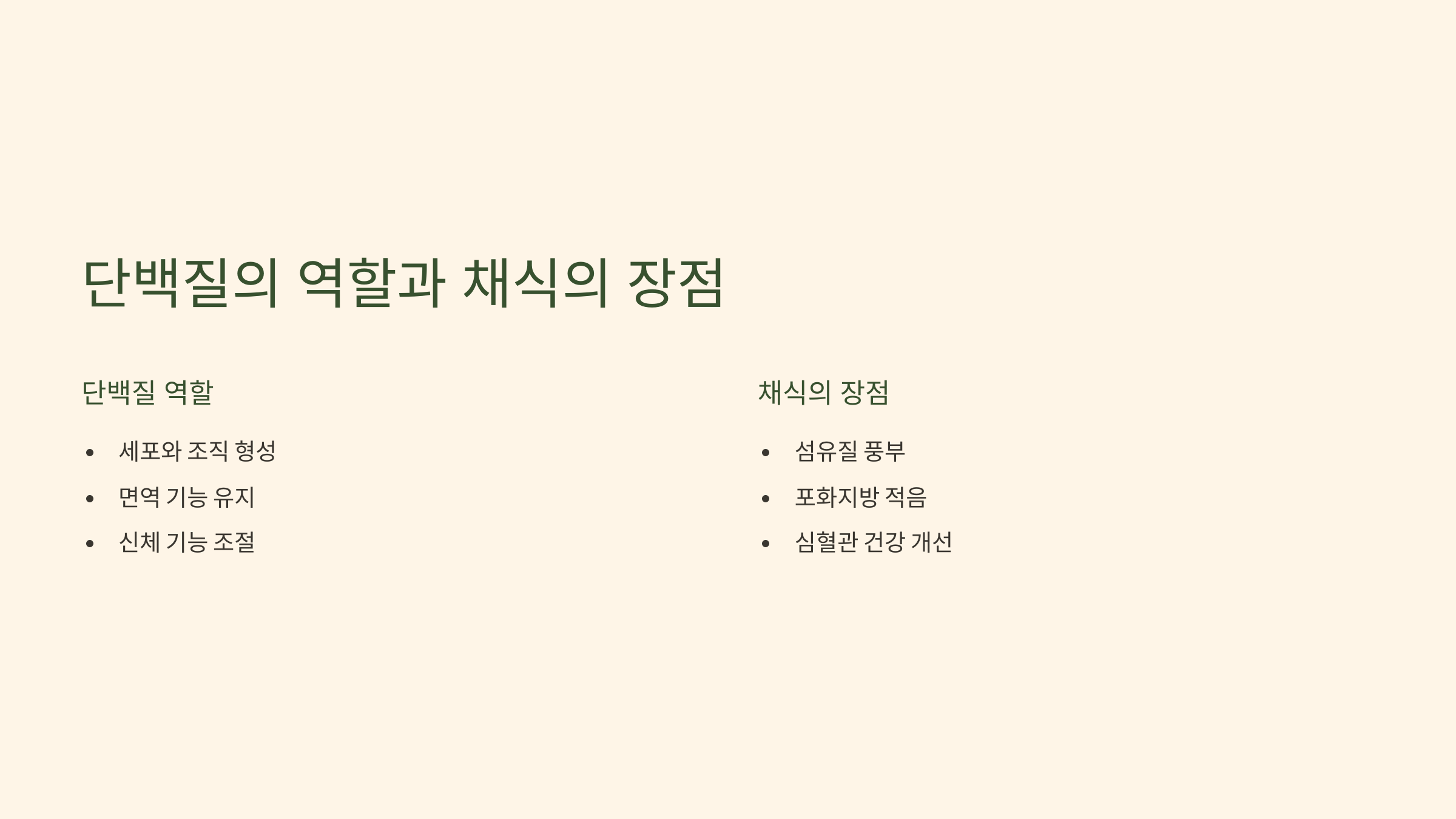 단백질은 세포와 조직을 형성하고 면역 기능을 유지하는 데 필수입니다. 채식 식단은 섬유질이 풍부하고 포화지방이 적어 심혈관 건강에 좋습니다. 동물성 단백질보다 가볍지만 식물성 단백질도 적절히 조합하면 충분한 효과를 기대할 수 있습니다.