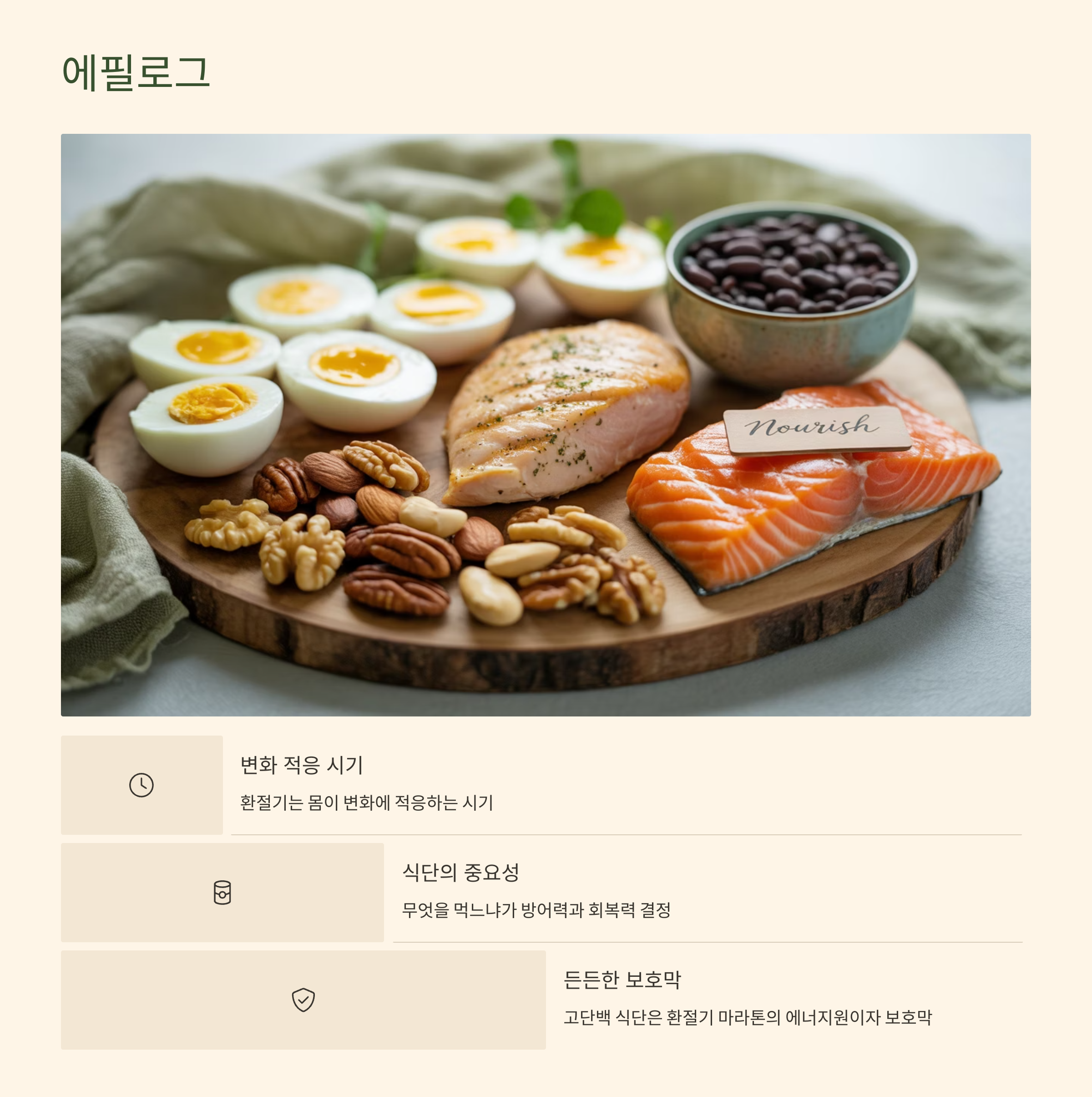 환절기는 우리 몸이 변화에 적응하며 잠시 숨을 고르는 시기입니다. 이럴 때일수록 무엇을 먹느냐가 내 몸의 방어력과 회복력을 결정합니다. 고단백 식단은 환절기라는 마라톤을 완주할 수 있도록 돕는 든든한 에너지원이자 보호막이 되어줄 것입니다. 오늘부터 여러분의 식탁에 건강한 단백질을 조금 더 채워보는 것은 어떨까요?