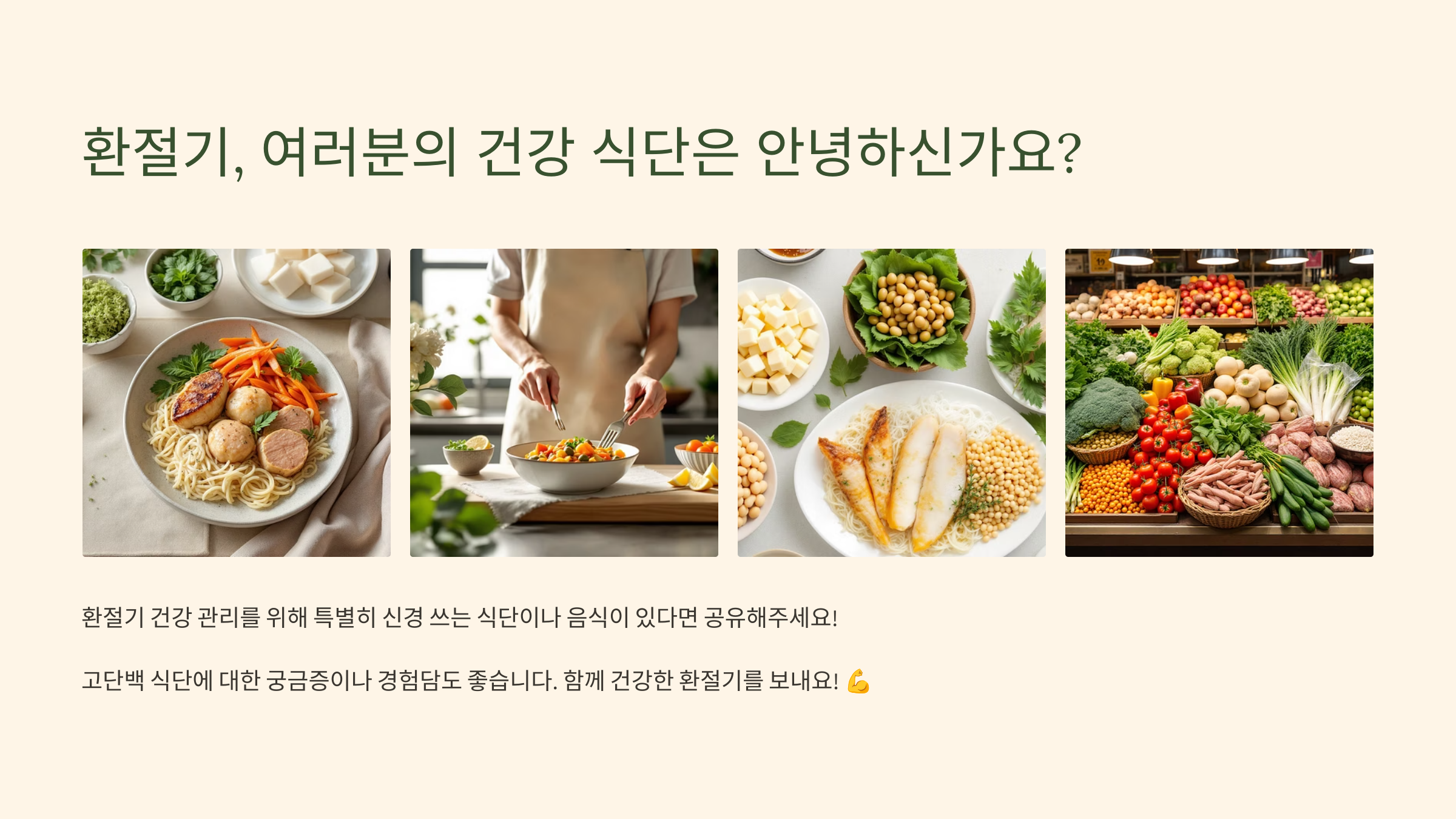 절기 건강 관리를 위해 특별히 신경 쓰는 식단이나 음식이 있다면 댓글로 공유해주세요! 고단백 식단에 대한 궁금증이나 경험담도 좋습니다. 함께 건강한 환절기를 보내요! 💪