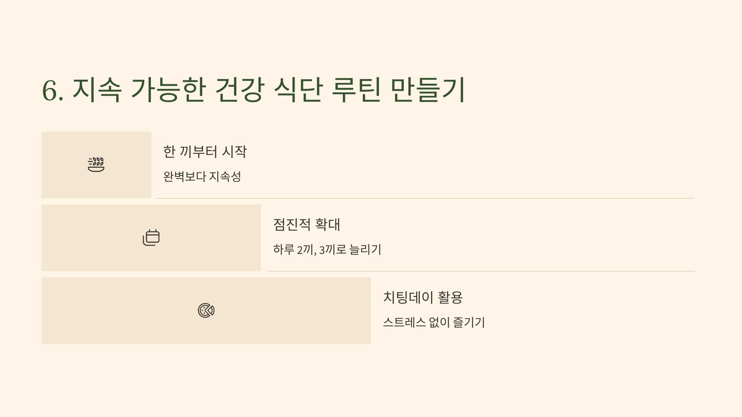 점차 하루 2끼, 3끼로 늘려가는 방식이 가장 지속 가능해요.