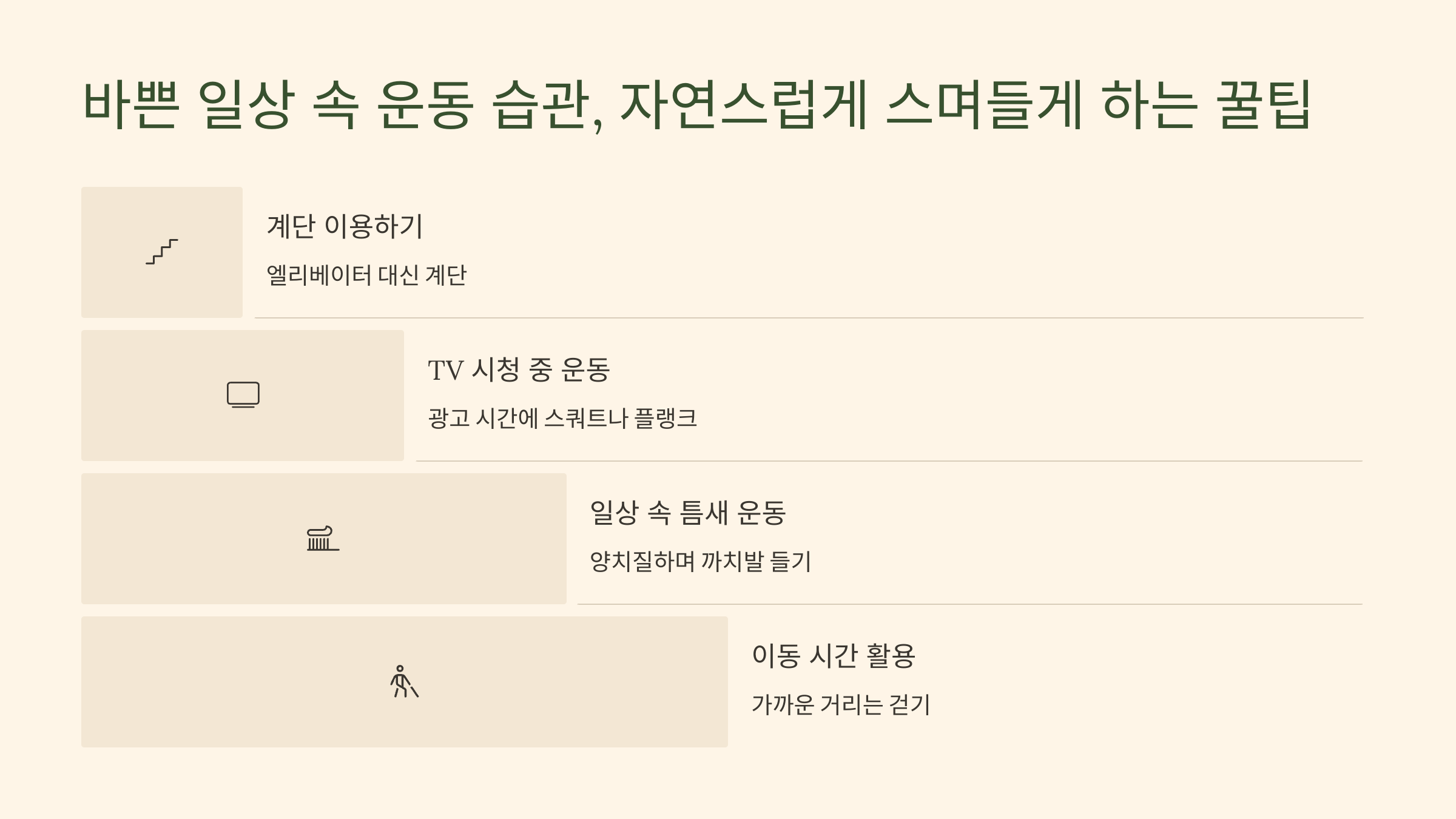 - 바쁜 일상 속 운동 습관, 자연스럽게 스며들게 하는 꿀팁