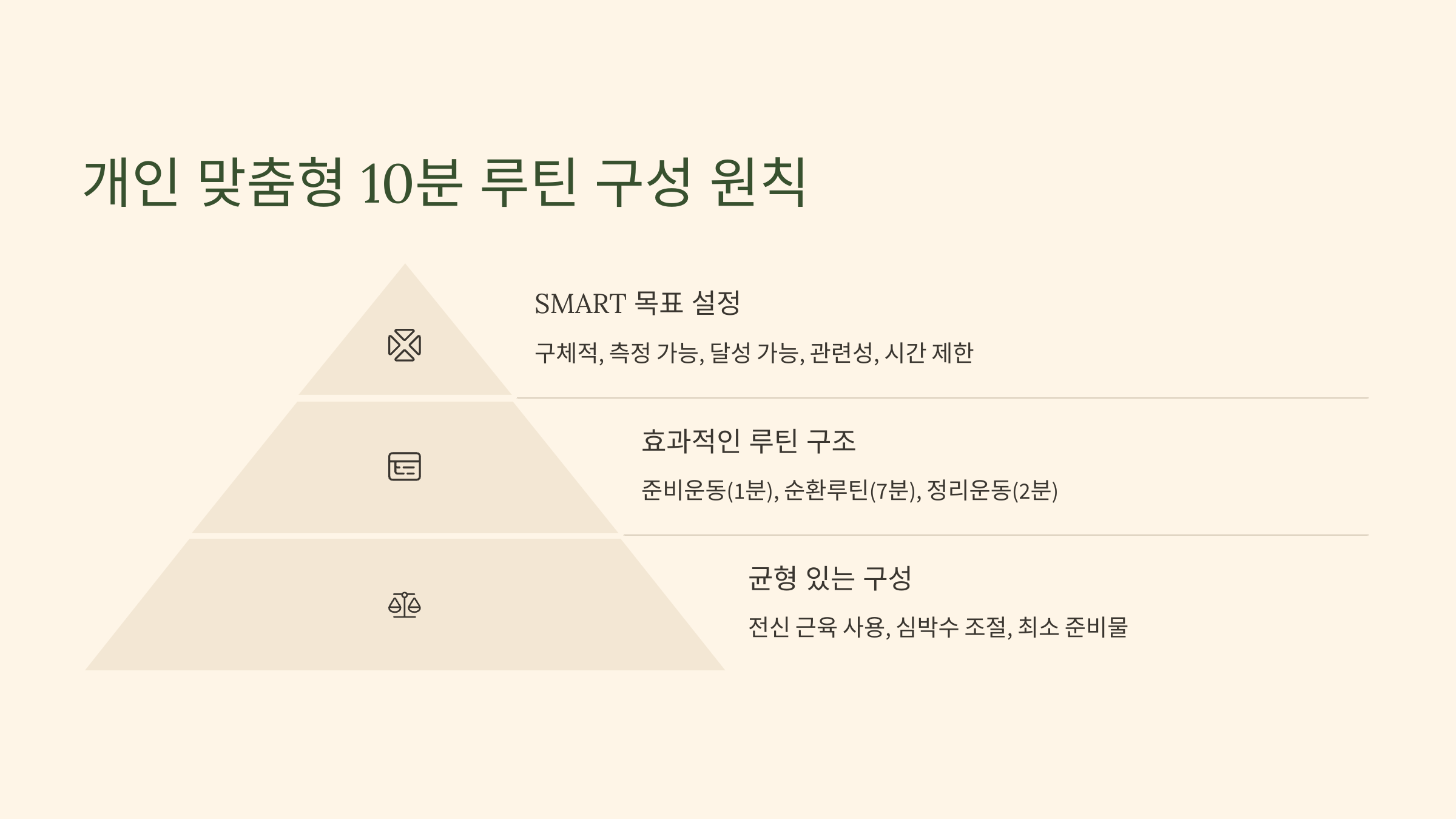 - 개인 맞춤형 10분 루틴 구성 원칙: SMART 목표 설정