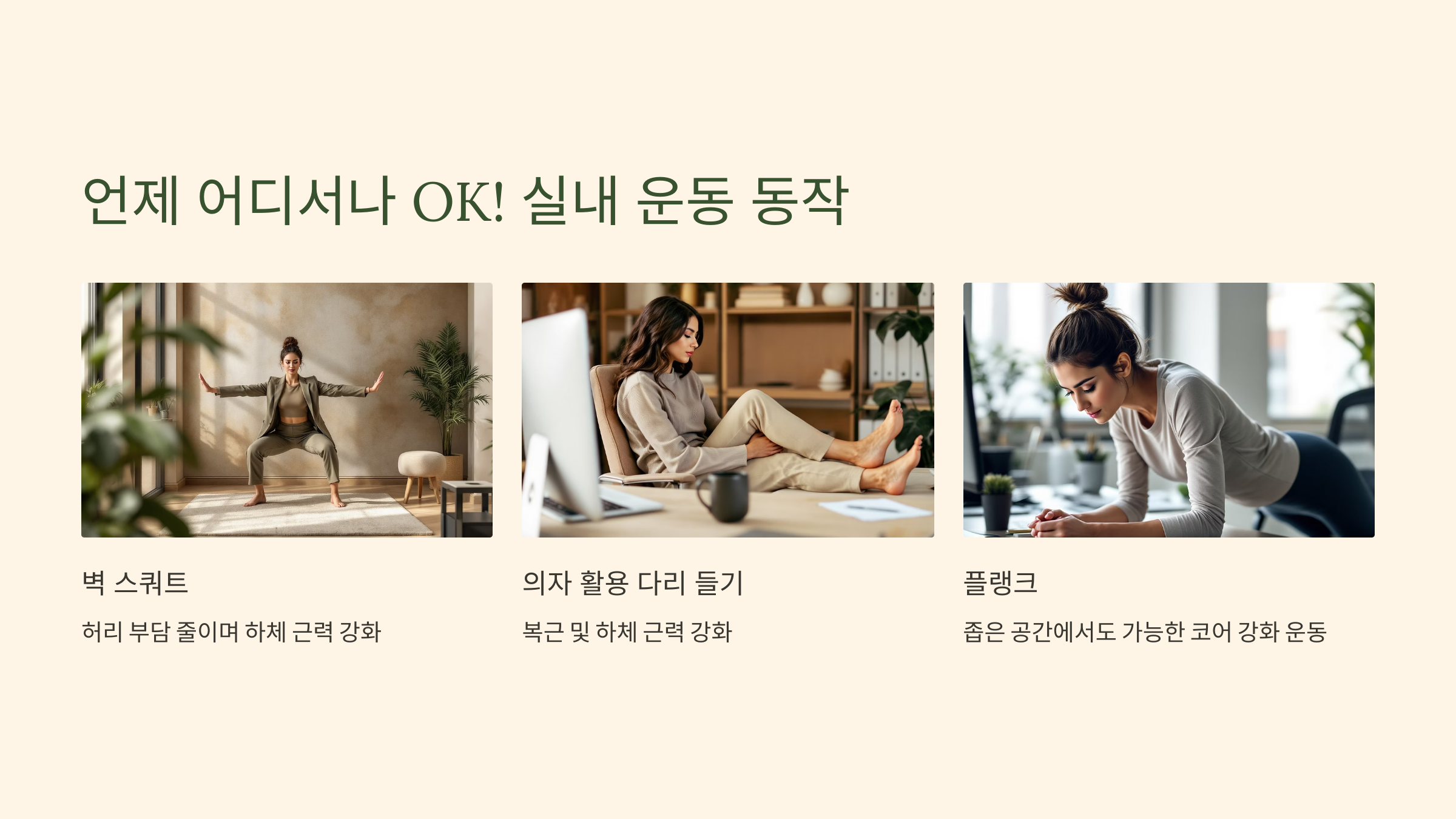 운동을 위해 굳이 넓은 공간이나 특별한 장비가 필요한 것은 아닙니다. 좁은 사무실 공간이나 집에서도 충분히 효과적인 운동이 가능합니다.