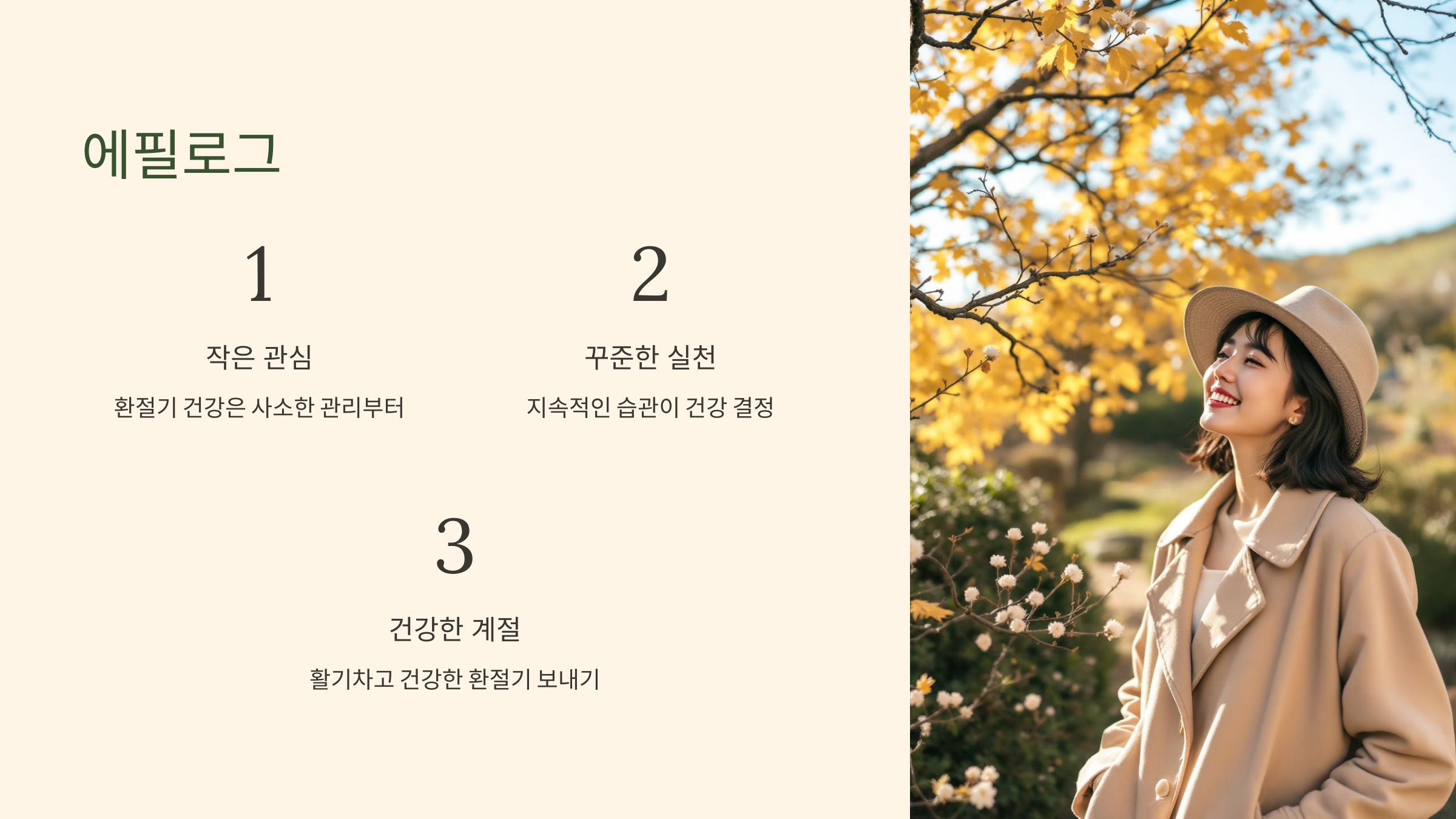 '매년 겪는 일인데 뭐...' 하고 넘기기엔 환절기 건강 관리는 생각보다 중요합니다. 작은 관심과 꾸준한 실천이 쌓여 더 활기차고 건강한 계절을 보낼 수 있게 해줄 거예요. 오늘 알려드린 내용들이 여러분의 건강한 환절기 나기에 조금이나마 도움이 되기를 바랍니다! 😊 다음에는 더욱 유익한 건강 정보로 찾아올게요!