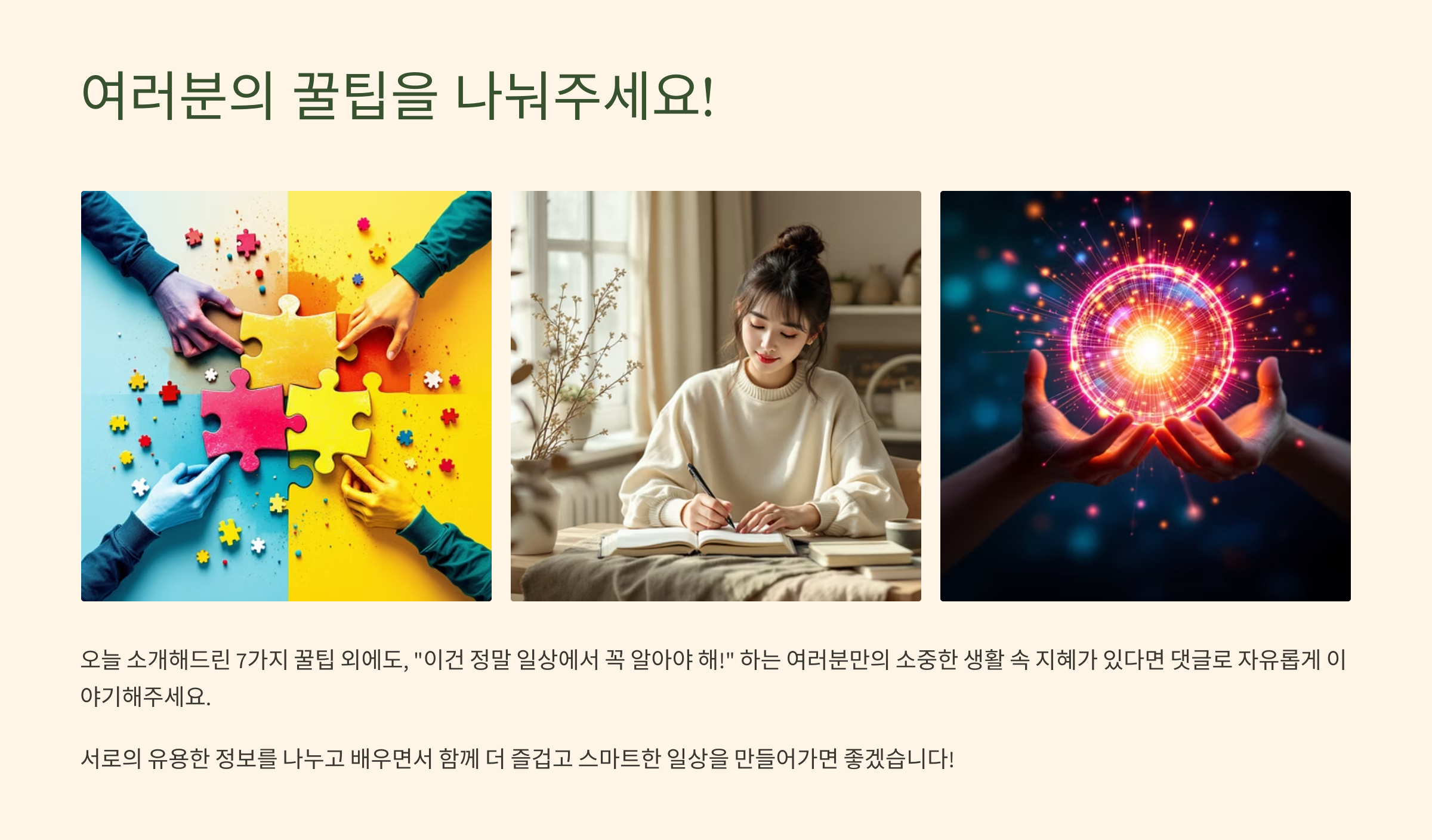 오늘 제가 소개해드린 7가지 꿀팁 외에도, "이건 정말 일상에서 꼭 알아야 해!" 하는 여러분만의 소중한 생활 속 지혜가 있다면 댓글로 자유롭게 이야기해주세요. 서로의 유용한 정보를 나누고 배우면서 함께 더 즐겁고 스마트한 일상을 만들어가면 좋겠습니다! 🙌