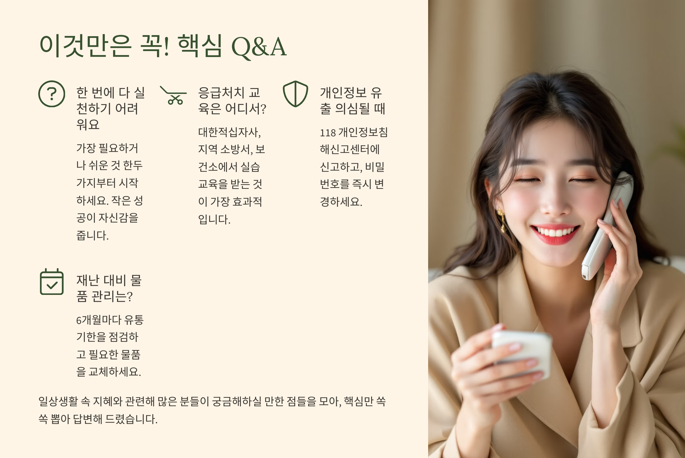 - '나만의 실천 리스트' 만들기: 오늘 알게 된 내용 중에서 '아, 이건 정말 나한테 필요하겠다!' 싶은 것, 또는 '이것부터 한번 해봐야지!' 하고 마음먹은 것들을 구체적으로 적어보세요. 막연하게 '잘해야지' 하는 것보다 '이번 주말에는 비상 배낭 내용물 점검하기' 라거나 '오늘 저녁부터 잠들기 1시간 전 스마트폰 보지 않기' 처럼 구체적인 행동 계획을 세우는 것이 실천 가능성을 높여준답니다.