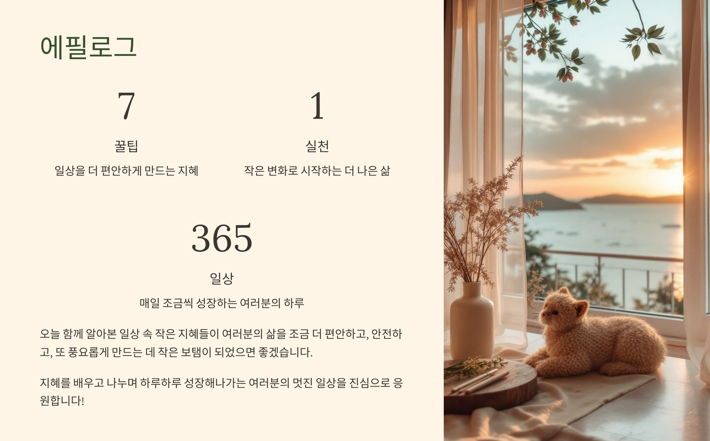 어떠셨나요? 오늘 함께 알아본 일상 속 작은 지혜들이 여러분의 삶을 조금 더 편안하고, 안전하고, 또 풍요롭게 만드는 데 작은 보탬이 되었으면 좋겠습니다. 거창한 변화가 아니더라도 괜찮아요. 오늘 알게 된 것 중 단 하나라도 꾸준히 실천한다면, 분명 여러분의 내일은 오늘보다 더 빛날 거예요. 지혜를 배우고 나누며 하루하루 성장해나가는 여러분의 멋진 일상을 진심으로 응원합니다! 😊 혹시 더 궁금한 점이나 나누고 싶은 이야기가 있다면 언제든 댓글 남겨주세요!