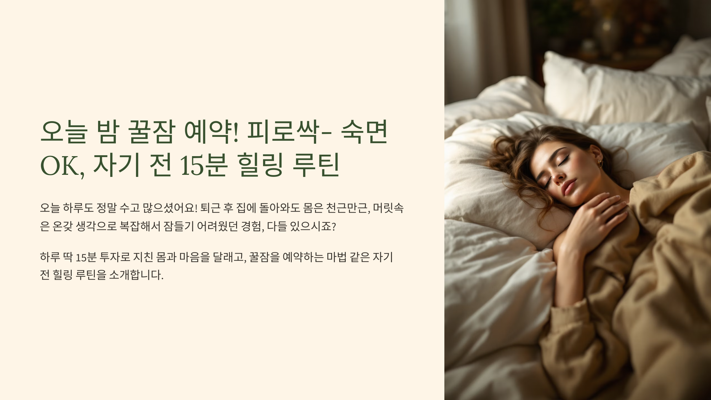오늘 하루도 정말 수고 많으셨어요! 퇴근 후 집에 돌아와도 몸은 천근만근, 머릿속은 온갖 생각으로 복잡해서 잠들기 어려웠던 경험, 다들 있으시죠? 😥 피곤한데 잠은 안 오고, 다음 날 아침은 더 피곤한 악순환... 이제 끊어낼 시간이에요! 하루 딱 15분 투자로 지친 몸과 마음을 달래고, 꿀잠을 예약하는 마법 같은 자기 전 힐링 루틴을 소개합니다. 거창한 운동이 아니에요. 부드러운 스트레칭과 차분한 명상, 편안한 음악이 함께하는 시간입니다. (실제로 많은 전문가와 연구에서 이 방법들이 도움이 된다고 이야기하고 있답니다!)