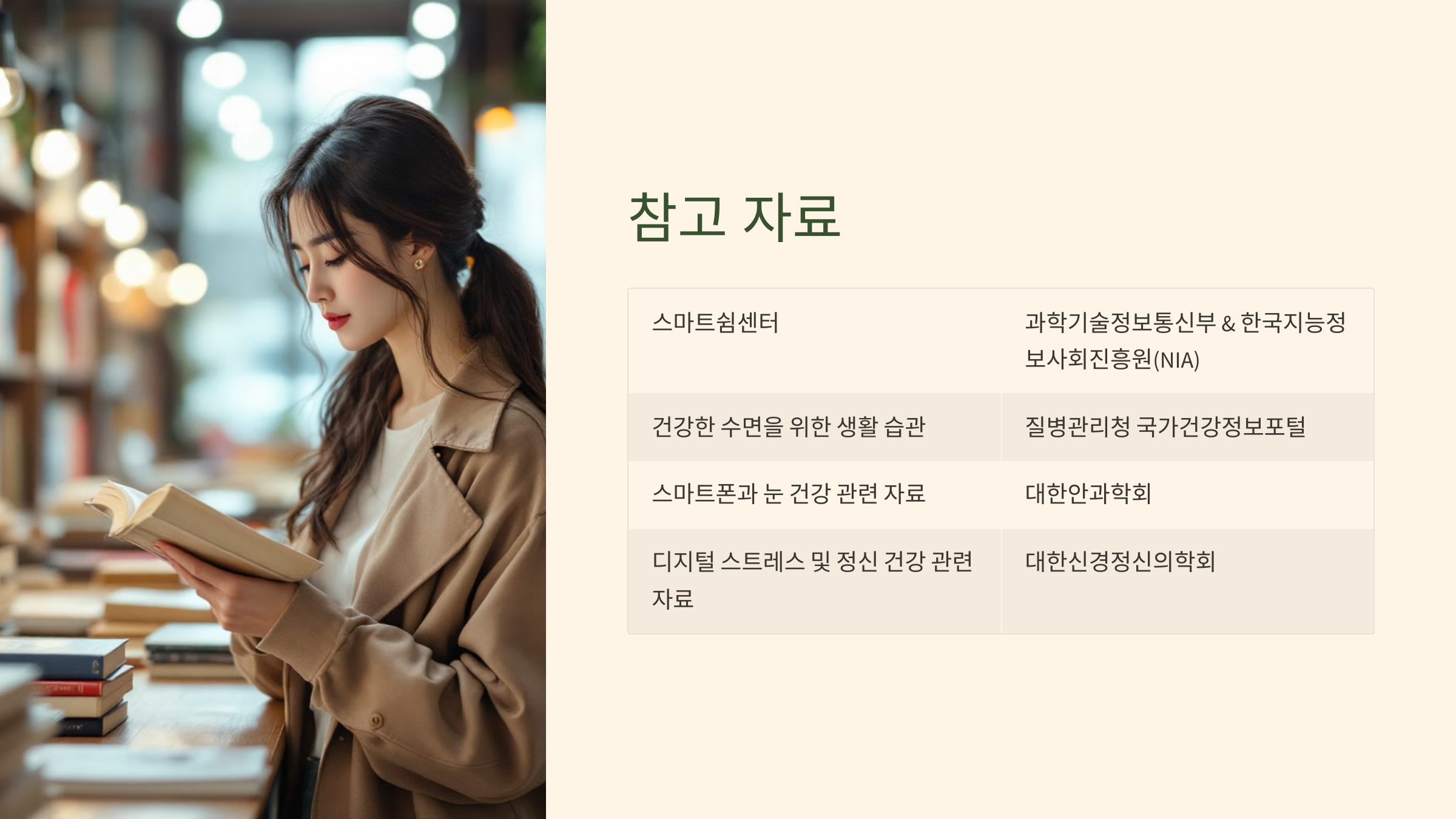 - 질병관리청 국가건강정보포털 - 건강한 수면을 위한 생활 습관: (블루라이트 및 전자기기 사용 관련 내용 - 해당 페이지에서 '수면' 검색)