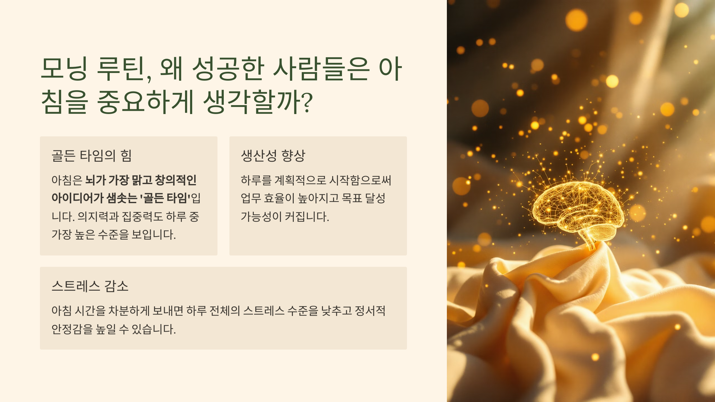 우리의 뇌는 잠자는 동안 하루 동안 쌓인 정보를 정리하고 재충전하는 시간을 가져요. 그래서 아침에 일어났을 때가 뇌가 가장 맑고 창의적인 아이디어가 샘솟는 '골든 타임'이라고 많은 뇌 과학자들이 이야기합니다. 의지력과 집중력 또한 하루 중 아침에 가장 높은 수준을 보인다고 해요. 이 소중한 시간을 그냥 흘려보내기엔 너무 아깝겠죠?