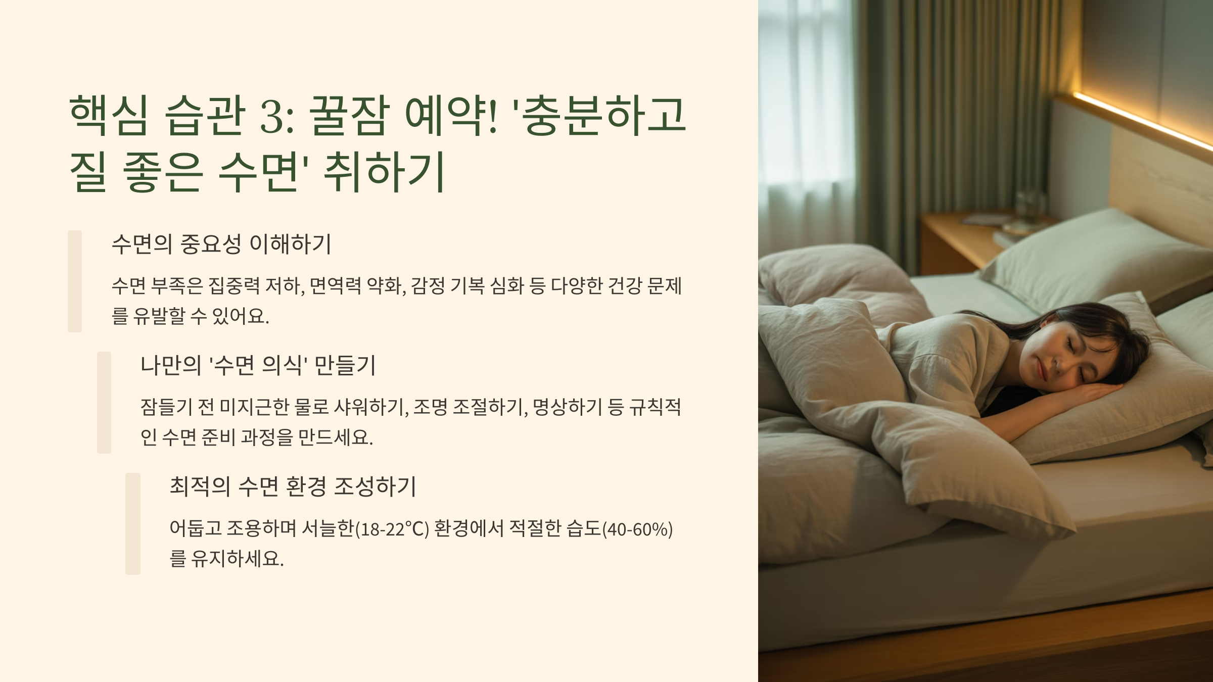 - 핵심 습관 3: 꿀잠 예약! '충분하고 질 좋은 수면' 취하기 😴