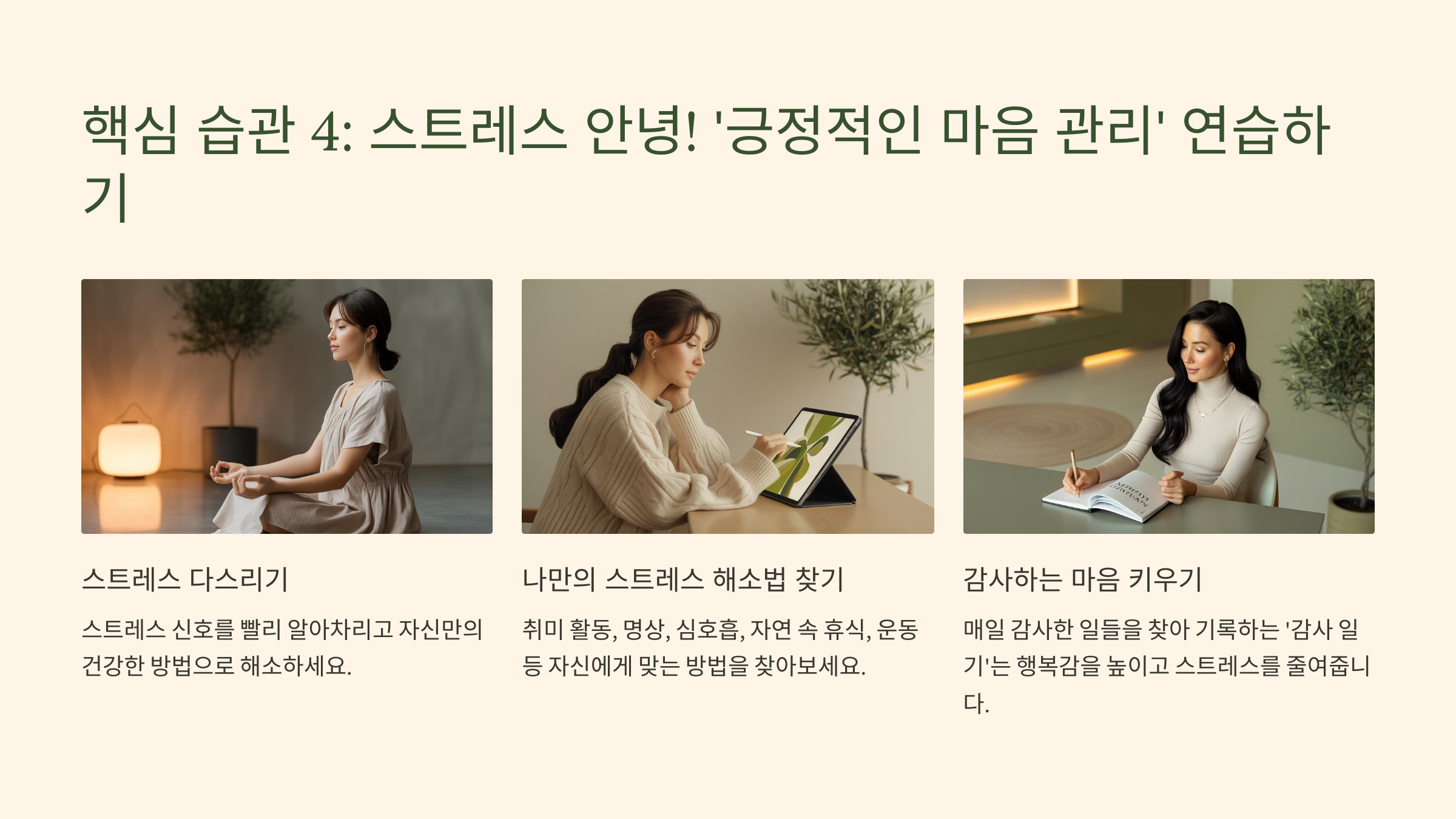 몸 건강만큼 중요한 것이 바로 마음 건강이죠! 스트레스는 만병의 근원이라고 할 만큼 우리 건강에 큰 영향을 미치는데요, 스트레스를 잘 관리하고 긍정적인 마음을 유지하는 습관은 건강한 삶의 필수 조건이랍니다.