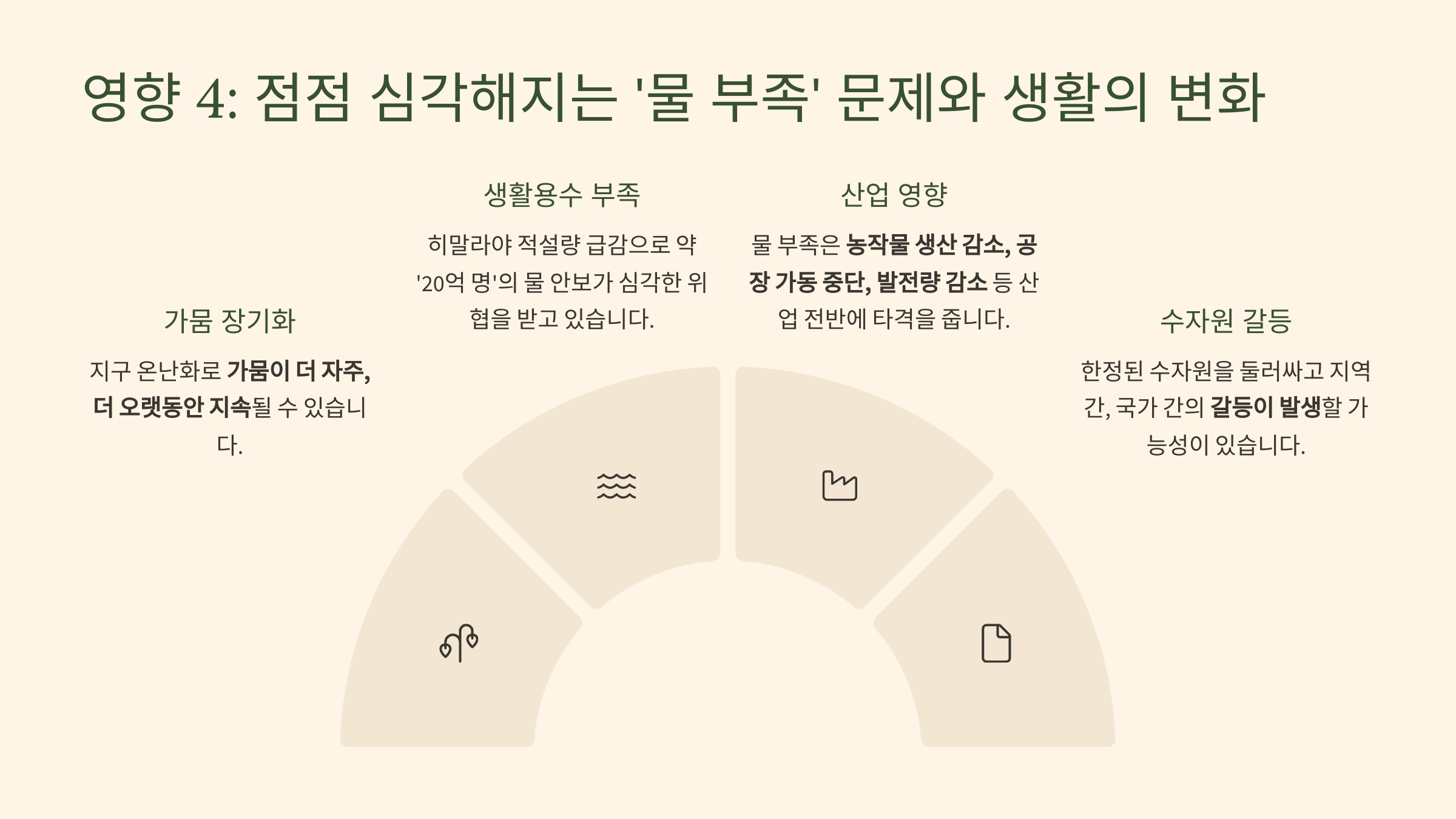 - 영향 4: 점점 심각해지는 '물 부족' 문제와 생활의 변화 💧