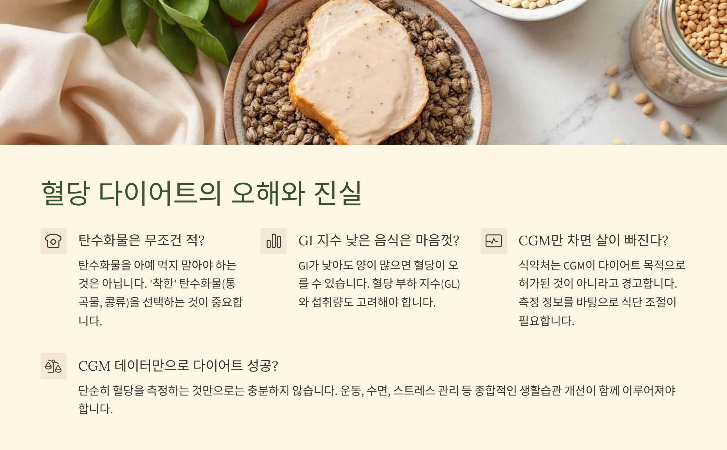 혈당 다이어트는 탄수화물을 아예 먹지 않는 '저탄고지'나 '키토제닉' 다이어트와는 달라요. 우리 몸에 꼭 필요한 에너지원인 탄수화물을 극단적으로 제한하면 오히려 건강을 해칠 수 있습니다. 중요한 것은 혈당을 빠르게 올리는 '나쁜' 탄수화물(설탕, 정제 곡물 등)을 피하고, 혈당을 천천히 올리는 '착한' 탄수화물(통곡물, 채소, 콩류 등)을 적절히 섭취하는 것입니다. - 개인의 건강 상태를 반드시 고려해야 해요.