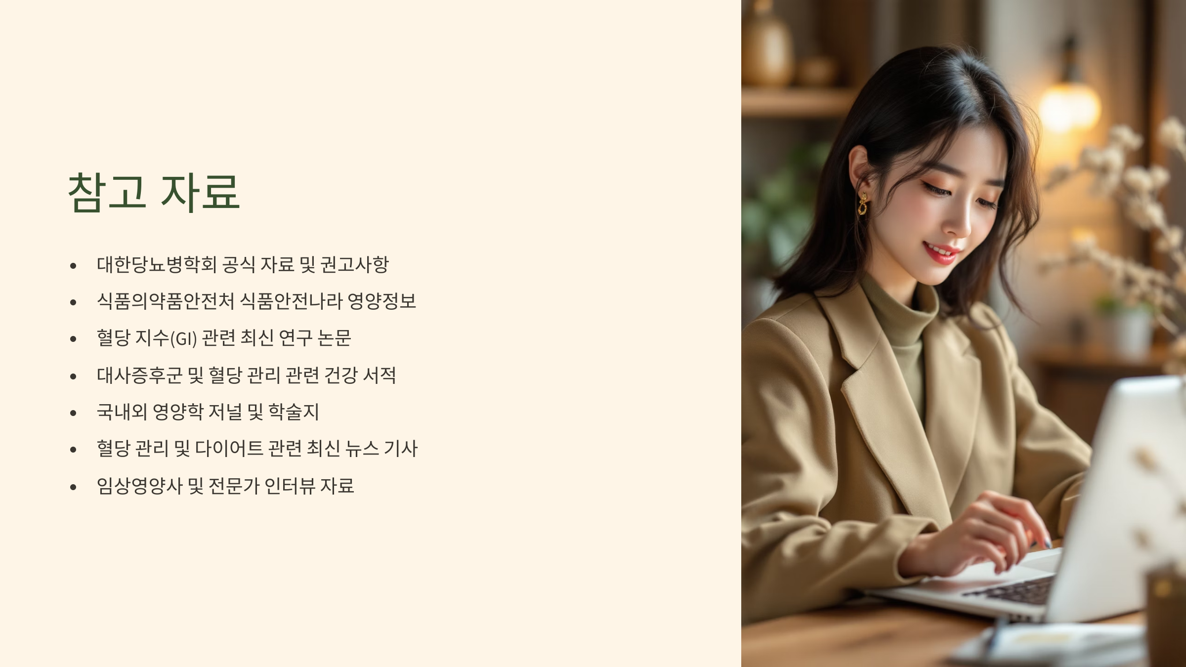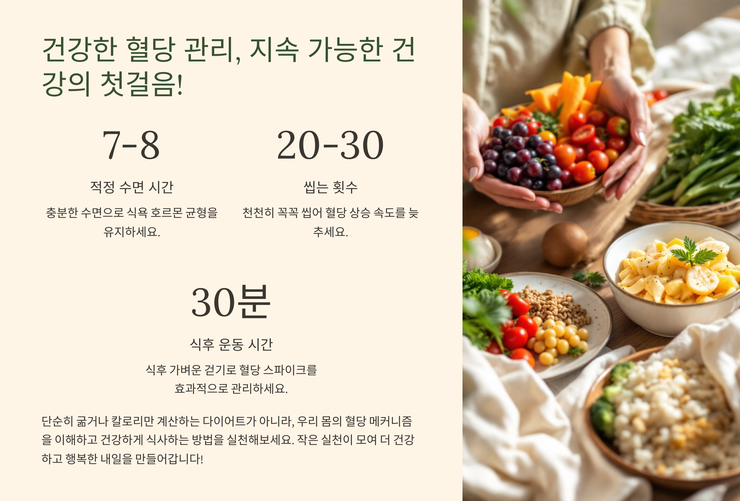 혈당 관리에만 너무 집중하다 보면 다른 필수 영양소 섭취가 부족해질 수 있어요. 특정 음식만 편식하거나 너무 제한적인 식단을 오래 지속하는 것은 영양 불균형을 초래할 수 있으므로, 다양한 식품을 통해 모든 영양소를 골고루 섭취하려는 노력이 필요합니다. - 단기 유행이 아닌, 평생 건강 습관으로!