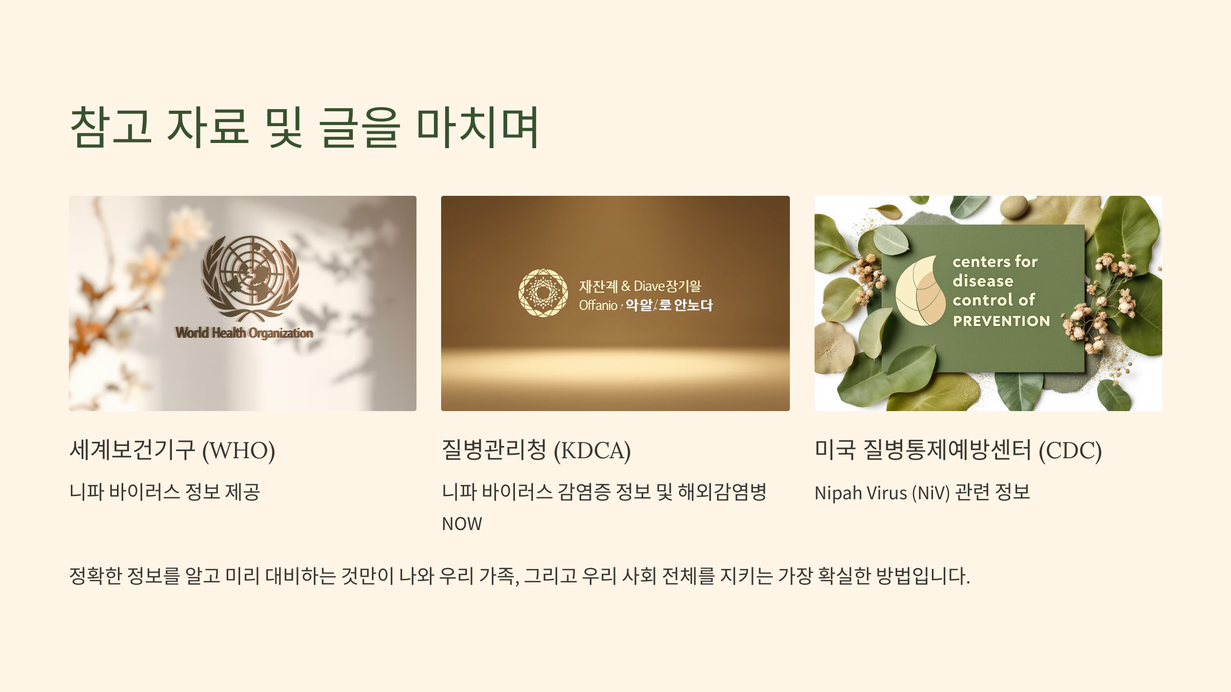 이 글을 작성하면서 니파 바이러스라는 질병의 위험성과 예방의 중요성을 다시 한번 깊이 깨닫게 되었습니다. 아직 우리나라에서는 발생하지 않았지만, 해외여행이 자유롭고 신종 감염병의 출현이 잦아지는 요즘, 먼 나라 이야기로만 치부할 수는 없다는 생각이 들었습니다. 정확한 정보를 알고 미리 대비하는 것만이 나와 우리 가족, 그리고 우리 사회 전체를 지키는 가장 확실한 방법이라는 것을 독자분들과 함께 공유하고 싶었습니다.