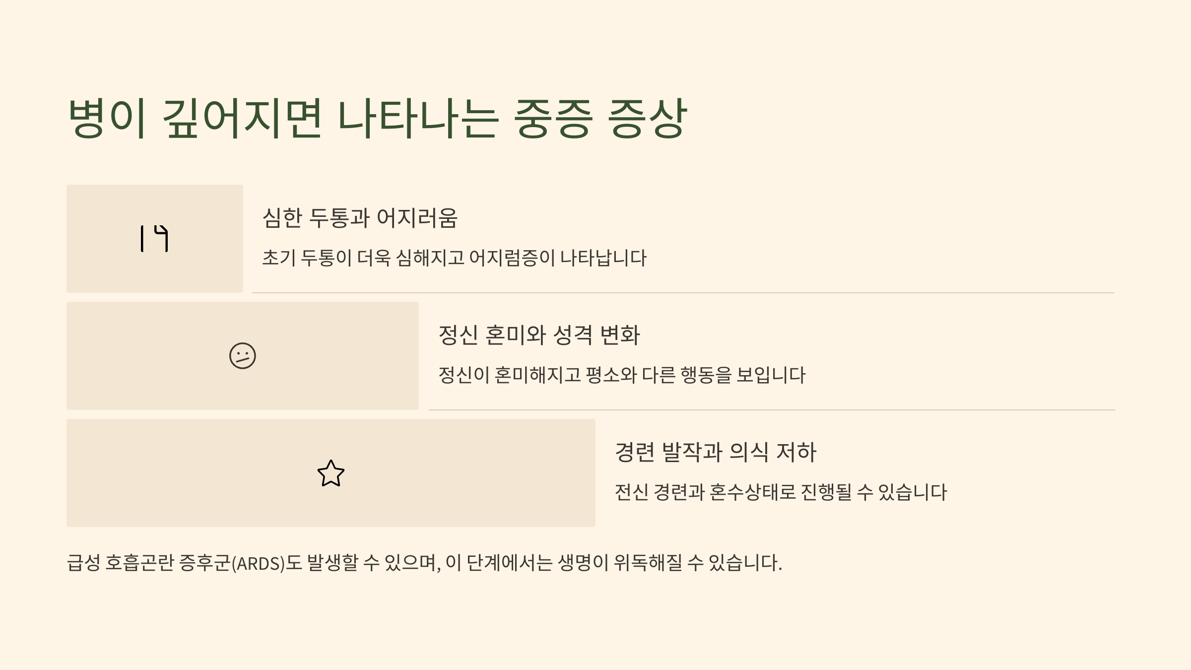 3. 병이 깊어지면 나타나는 '중증 증상' (뇌염과 호흡곤란) 🧠💨
