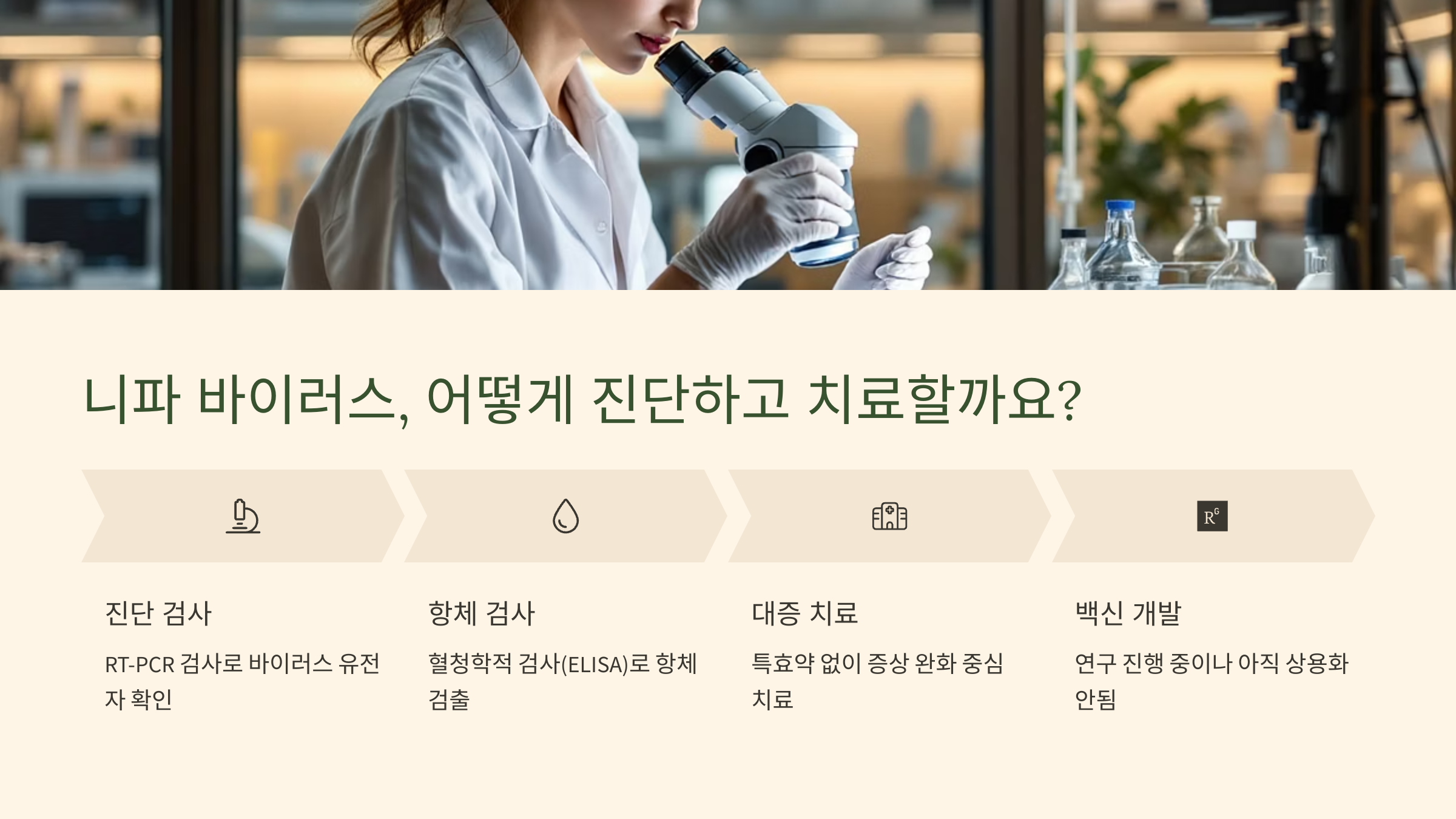 니파 바이러스 감염이 의심될 경우, 정확한 진단과 신속한 치료(비록 대증 요법 중심이지만)가 매우 중요합니다. 현재까지 알려진 진단 및 치료법은 다음과 같습니다.