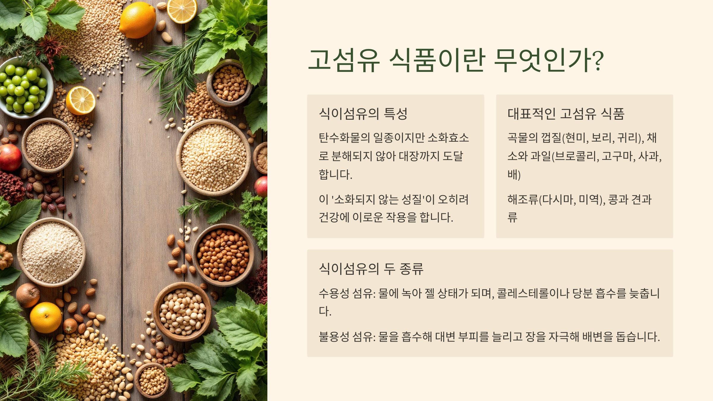 고섬유 식품이란 말 그대로 식이섬유 함량이 높은 식품군을 뜻해요. 식이섬유는 탄수화물의 일종이지만 우리 몸의 소화효소로는 분해되지 않아서, 끝까지 소화되지 않고 대장까지 도달하게 됩니다. 그런데 이 '소화되지 않는 성질'이 오히려 건강에 이로운 작용을 하게 만들죠.