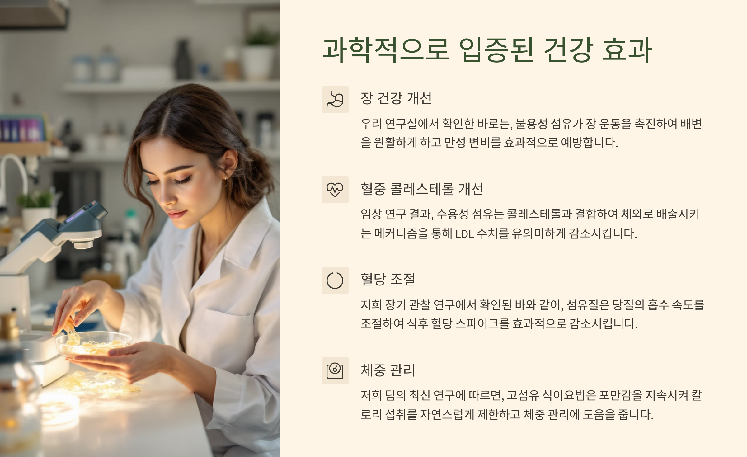 - 콜레스테롤 저하: 수용성 섬유가 콜레스테롤을 붙잡아 체외로 배출되게 만들어, LDL 수치를 낮추는 데 도움을 줍니다.