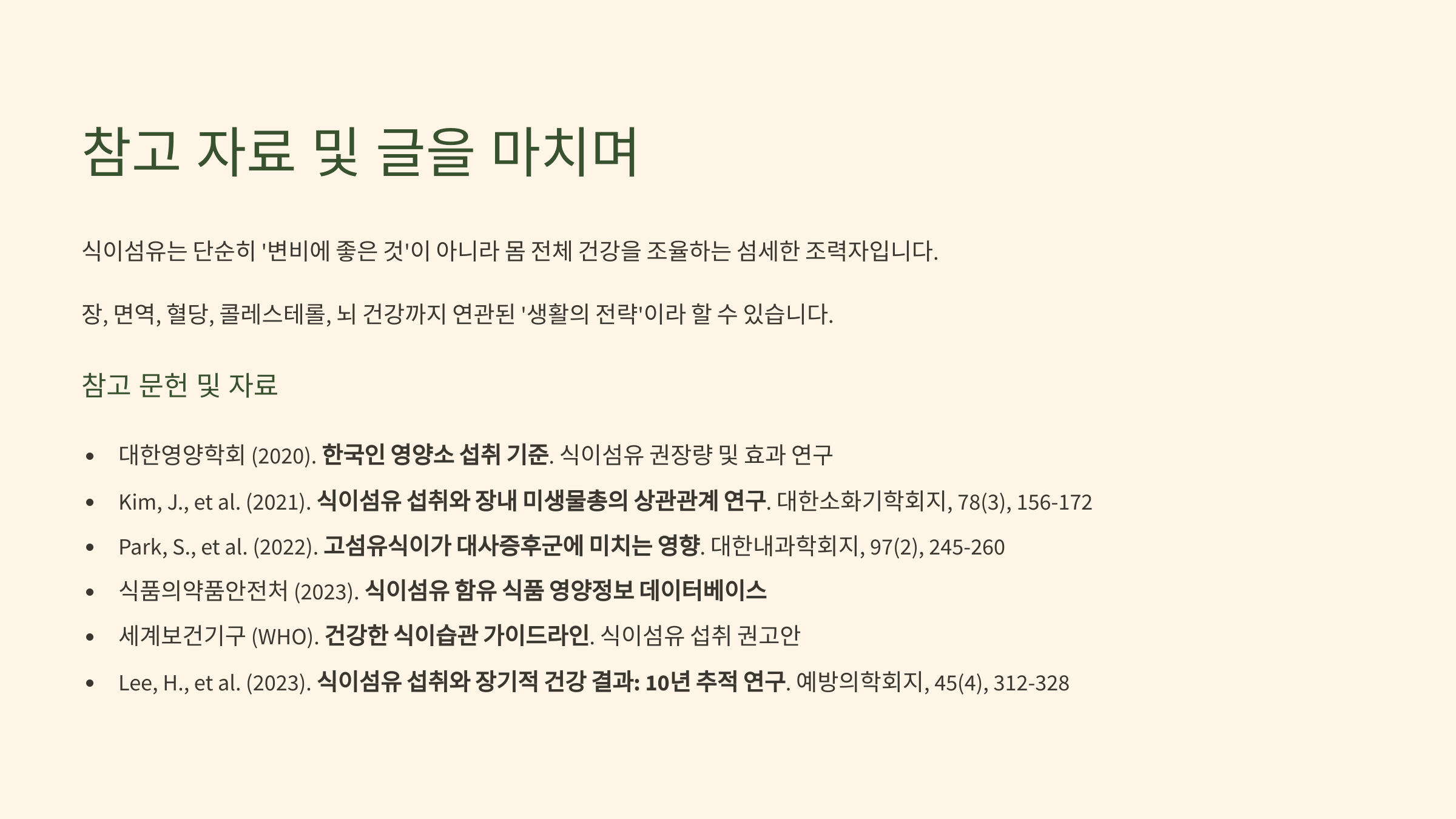 이번 글을 준비하면서, 식이섬유라는 것이 단순히 ‘변비에 좋은 것’이 아니라 우리 몸 전체의 건강을 조율하는 섬세한 조력자라는 사실을 다시금 느꼈습니다. 특히 장과 면역, 혈당, 콜레스테롤, 심지어 뇌 건강까지도 연관이 있다는 점에서, 고섬유 식품은 단순한 식품군이 아닌 ‘생활의 전략’이라고도 할 수 있겠더라고요.