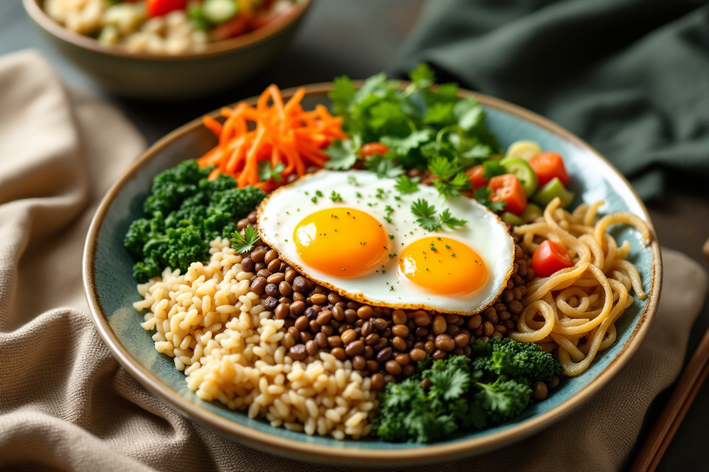 - 준비물: 현미밥 1공기, 삶은 렌틸콩 3큰술, 각종 채소(상추, 깻잎, 오이, 당근, 새싹채소 등) 적당량, 달걀 프라이 1개, (선택) 닭가슴살이나 두부