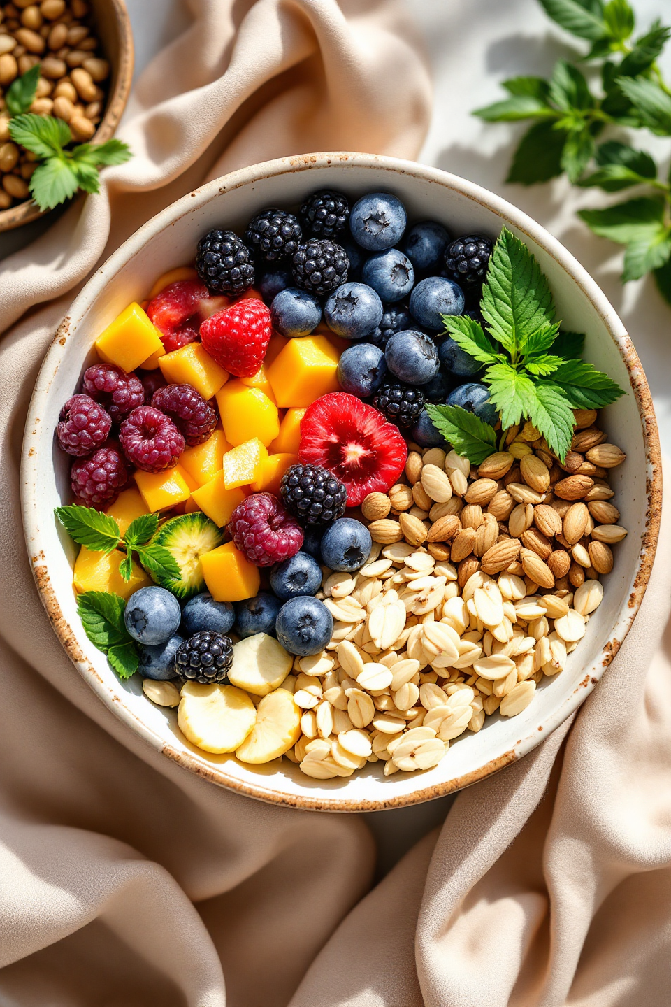 - 준비물: 오트밀 3-4큰술, 플레인 요거트 1개(100-150g), 좋아하는 베리류 한 줌, 견과류 약간, (선택) 꿀이나 메이플 시럽 약간