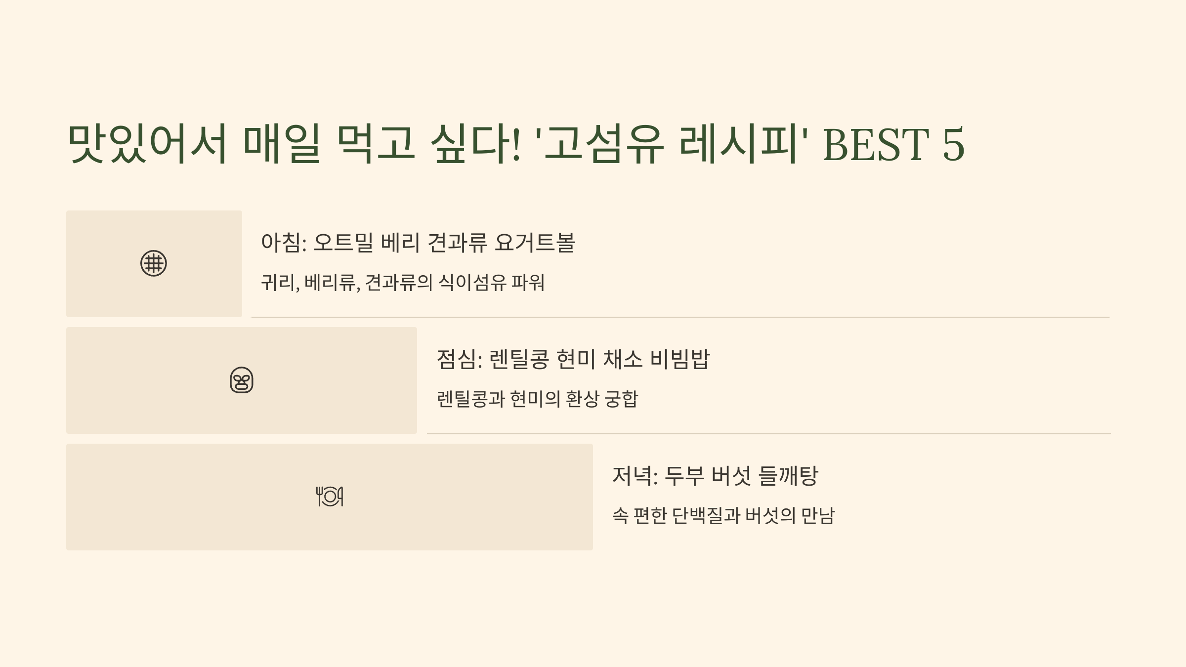 자, 이제 이론은 충분히 알았으니 실전으로 들어가 볼까요? 어렵고 맛없는 건강식은 이제 그만! 핼시노트가 추천하는 맛있고 만들기 쉬운 '고섬유 레시피'로 오늘부터 여러분의 식탁을 건강하게 바꿔보세요!