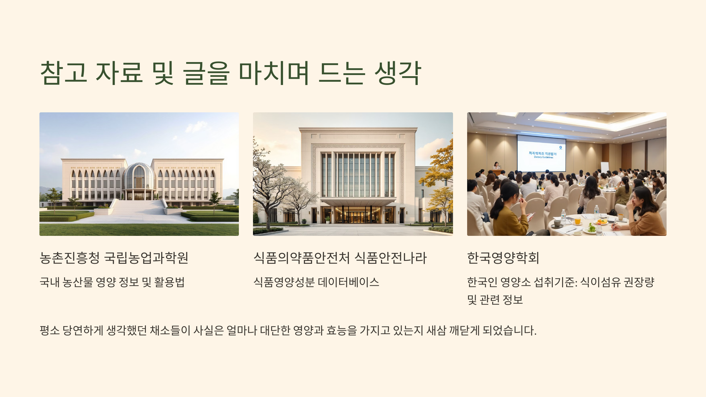 이 글을 준비하면서, 평소 우리가 너무나 당연하게 생각했던 주변의 채소들이 사실은 얼마나 대단한 영양과 효능을 가지고 있는지 새삼 깨닫게 되었습니다. 화려하진 않지만 묵묵히 우리 건강을 지켜주는 '저렴이 채소'들의 소중함을 많은 분들이 알아주셨으면 하는 바람입니다. 또한, 식이섬유가 단순히 변비에만 좋은 것이 아니라 우리 몸 전체의 건강 밸런스를 잡는 데 얼마나 중요한 역할을 하는지 다시 한번 느꼈습니다. 이 글이 독자 여러분의 식탁을 더 건강하고 풍성하게 만드는 데 작은 영감을 드릴 수 있었으면 좋겠습니다.
