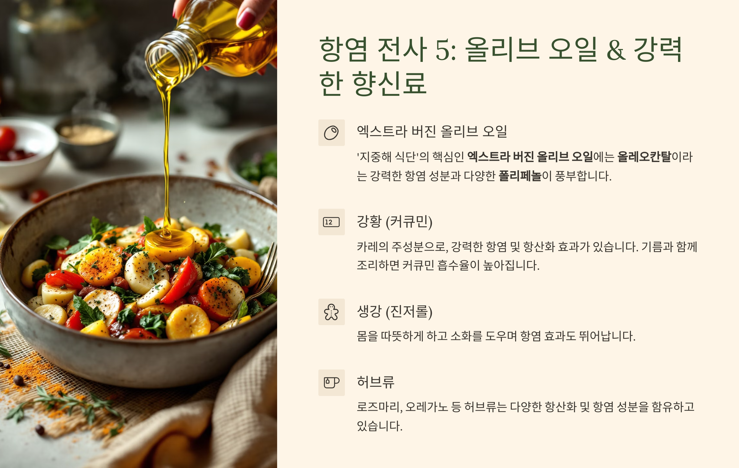 (5) 항염 전사 5: 올리브 오일 & 강력한 향신료 (폴리페놀과 천연 항염 성분!)