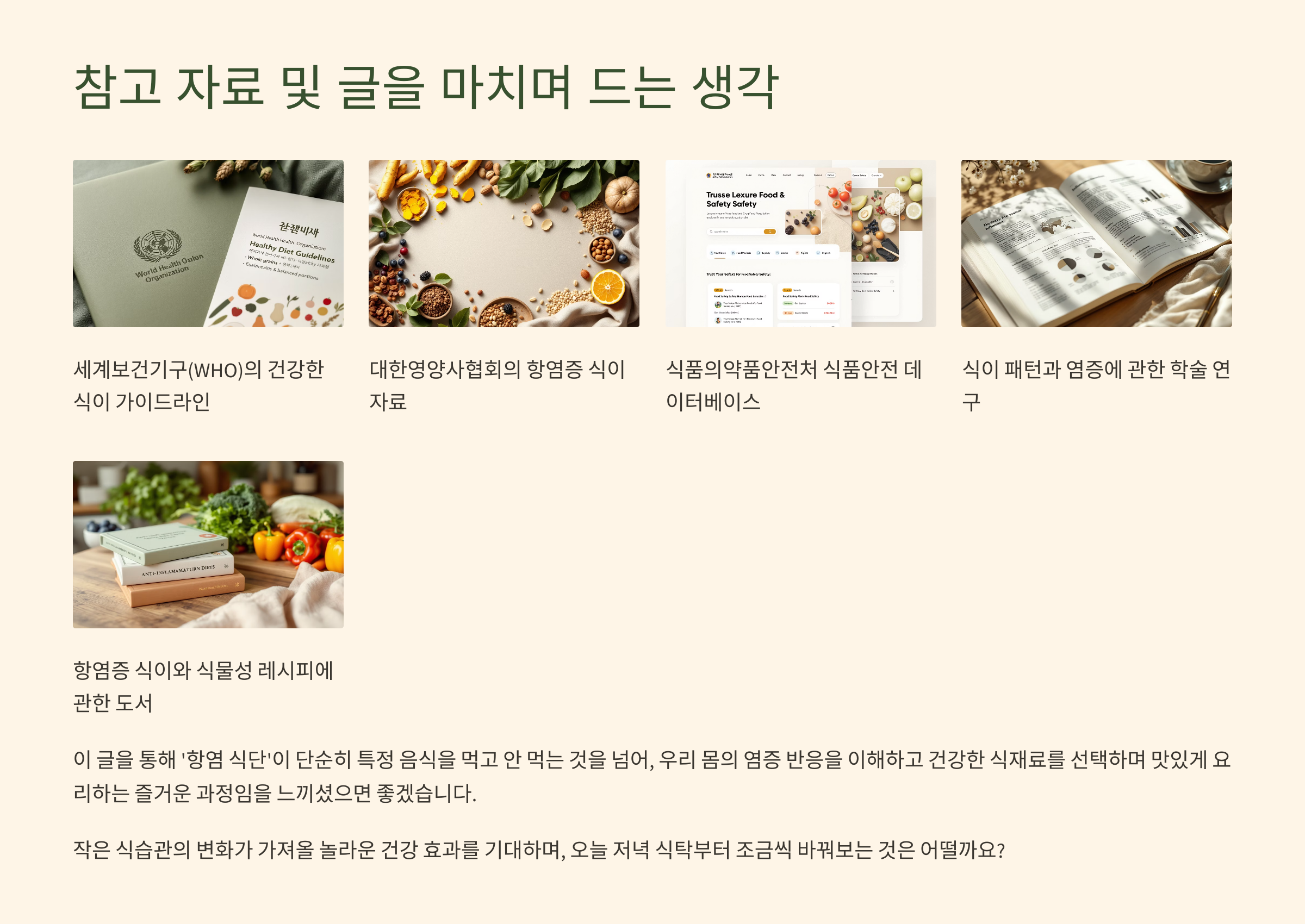 - (서적 예시) 『염증 해방』(정세연 저), 『최강의 식물식 레시피』(매튜 케니 저) 등 항염 식단 및 레시피 관련 서적