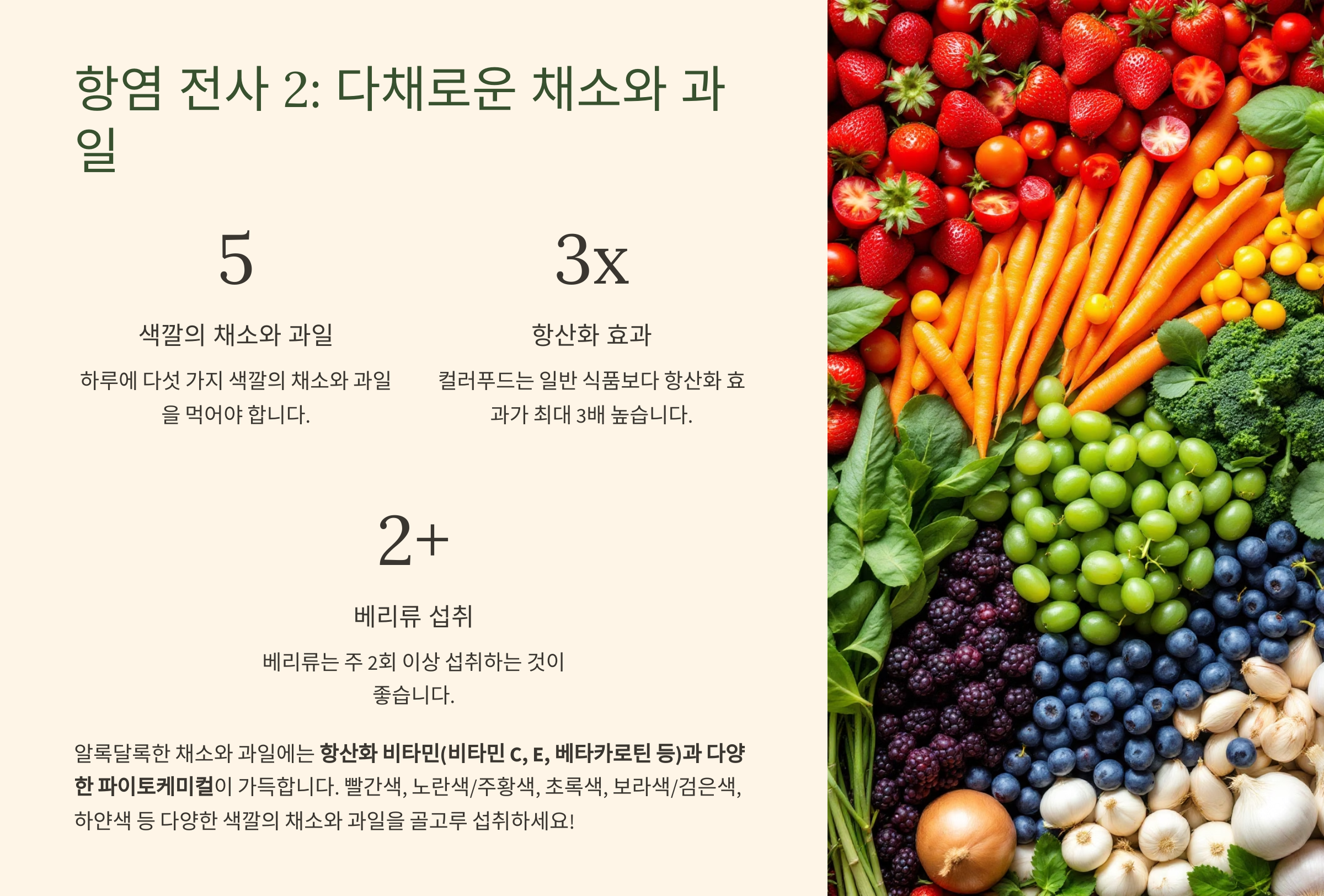 "하루에 다섯 가지 색깔의 채소와 과일을 먹어라!"라는 말, 들어보셨죠? 알록달록한 채소와 과일에는 우리 몸의 염증과 싸우는 강력한 무기, 항산화 비타민(비타민 C, E, 베타카로틴 등)과 다양한 파이토케미컬(식물성 생리활성물질)이 가득 들어있기 때문이에요.
