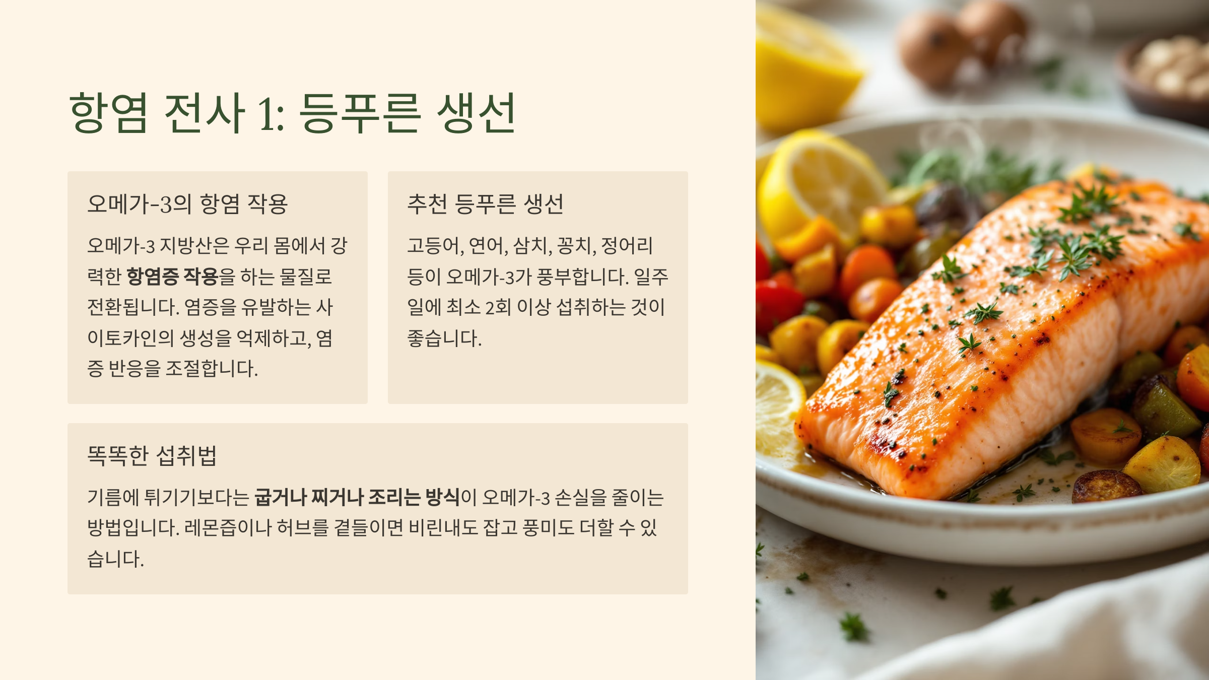 - (1) 항염 전사 1: 등푸른 생선 (오메가-3의 강력한 항염 파워!)