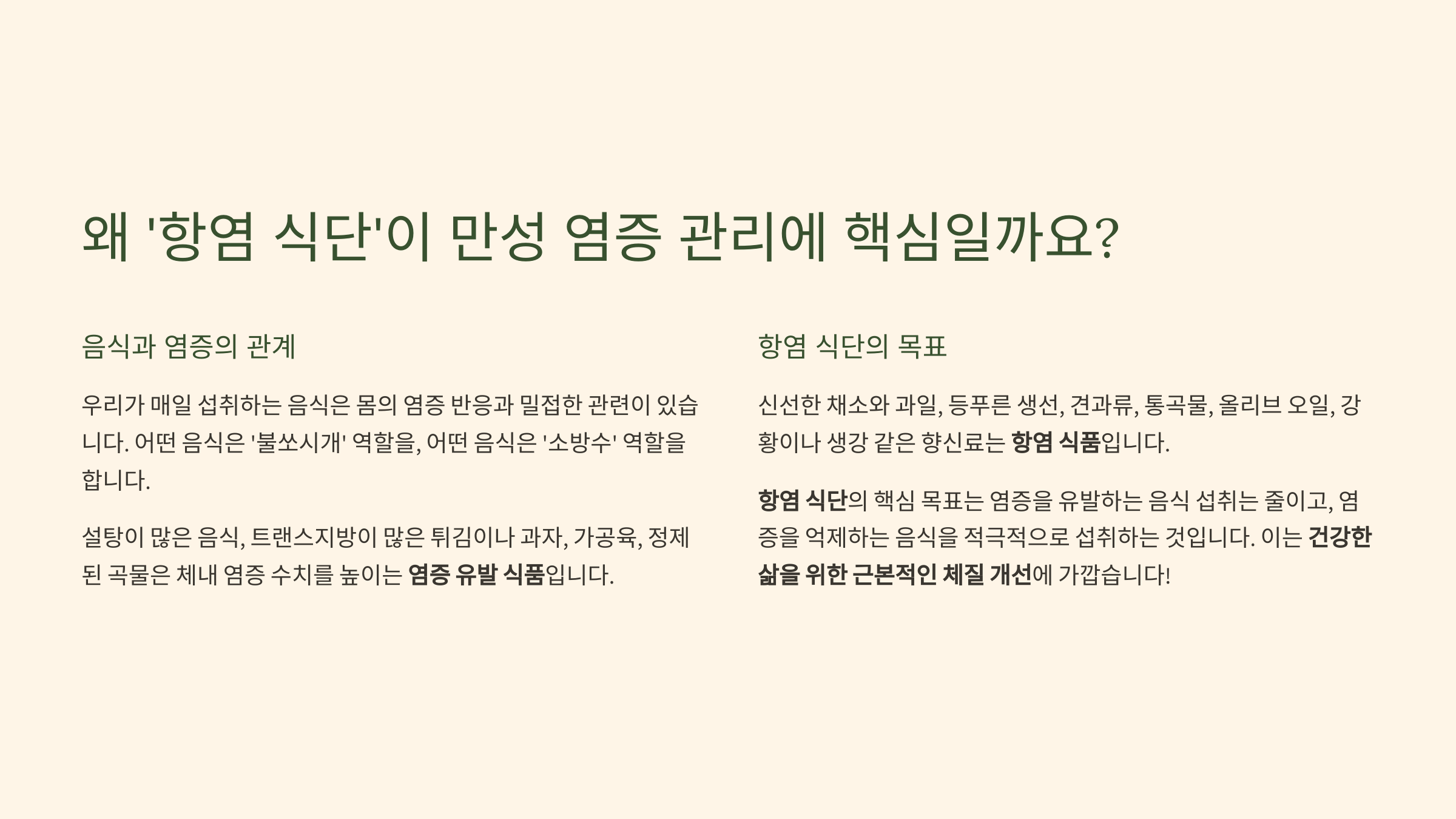 - 왜 '항염 식단'이 만성 염증 관리에 핵심일까요? (음식과 염증의 관계)