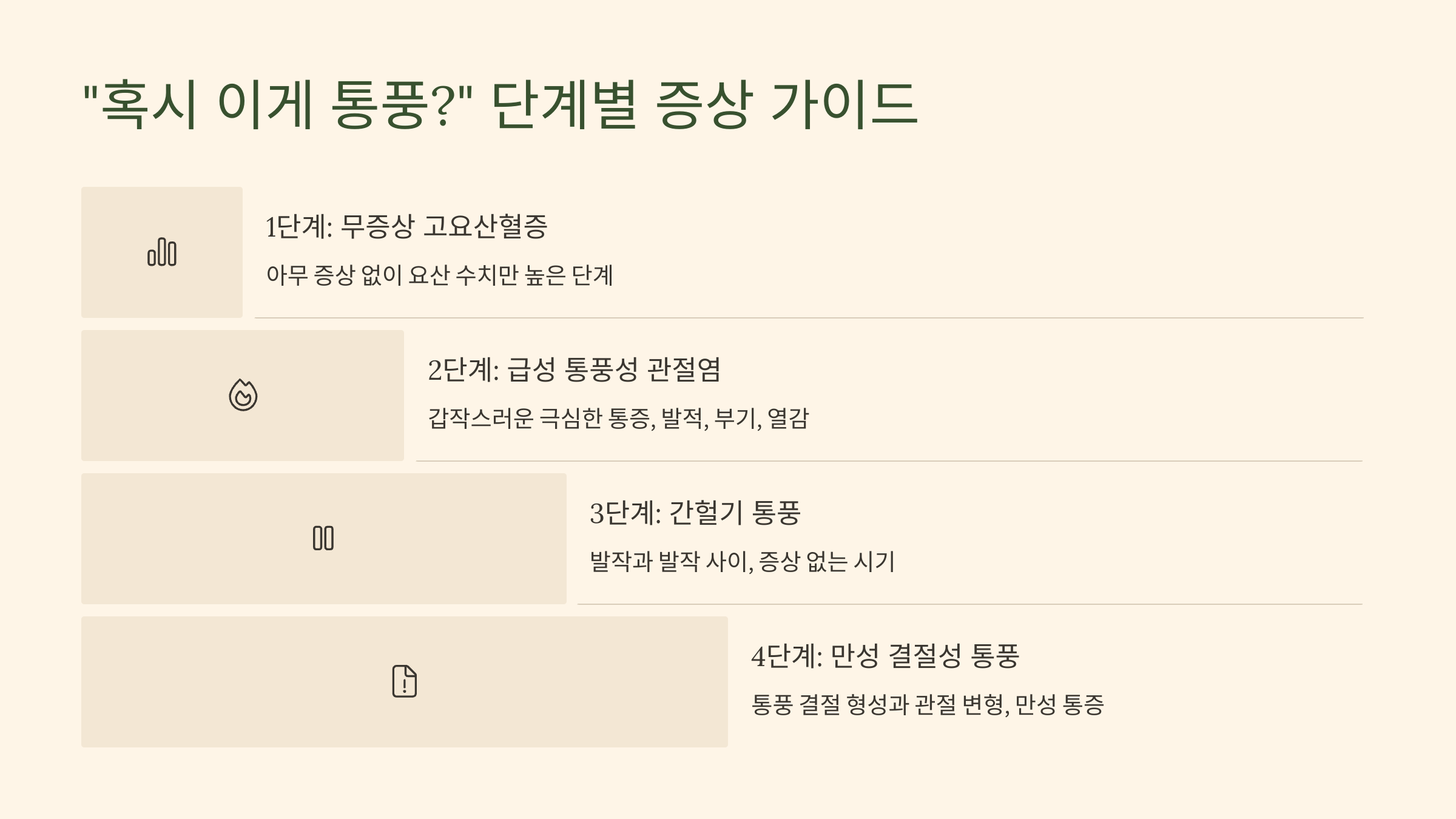 통풍은 하루아침에 갑자기 생기는 병이 아니에요. 여러 단계를 거쳐 서서히 진행되는데, 각 단계별 증상을 미리 알아두면 조기에 대처하는 데 도움이 될 수 있습니다.