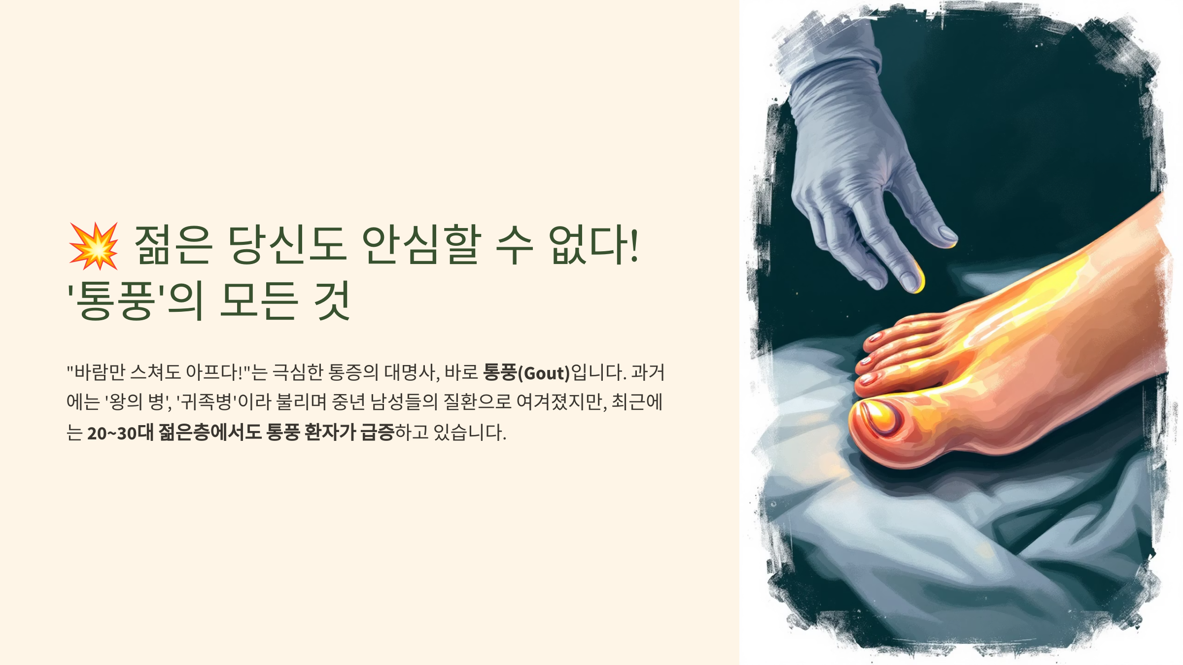 "바람만 스쳐도 아프다!"는 극심한 통증의 대명사, 바로 통풍(Gout)입니다. 과거에는 '왕의 병', '귀족병'이라 불리며 중년 남성들의 질환으로 여겨졌지만, 최근에는 서구화된 식습관과 생활 방식의 변화로 인해 20~30대 젊은층에서도 통풍 환자가 급증하고 있다는 사실, 알고 계셨나요? 😥 더 이상 남의 이야기가 아닌, 우리 모두의 건강을 위협할 수 있는 통풍!