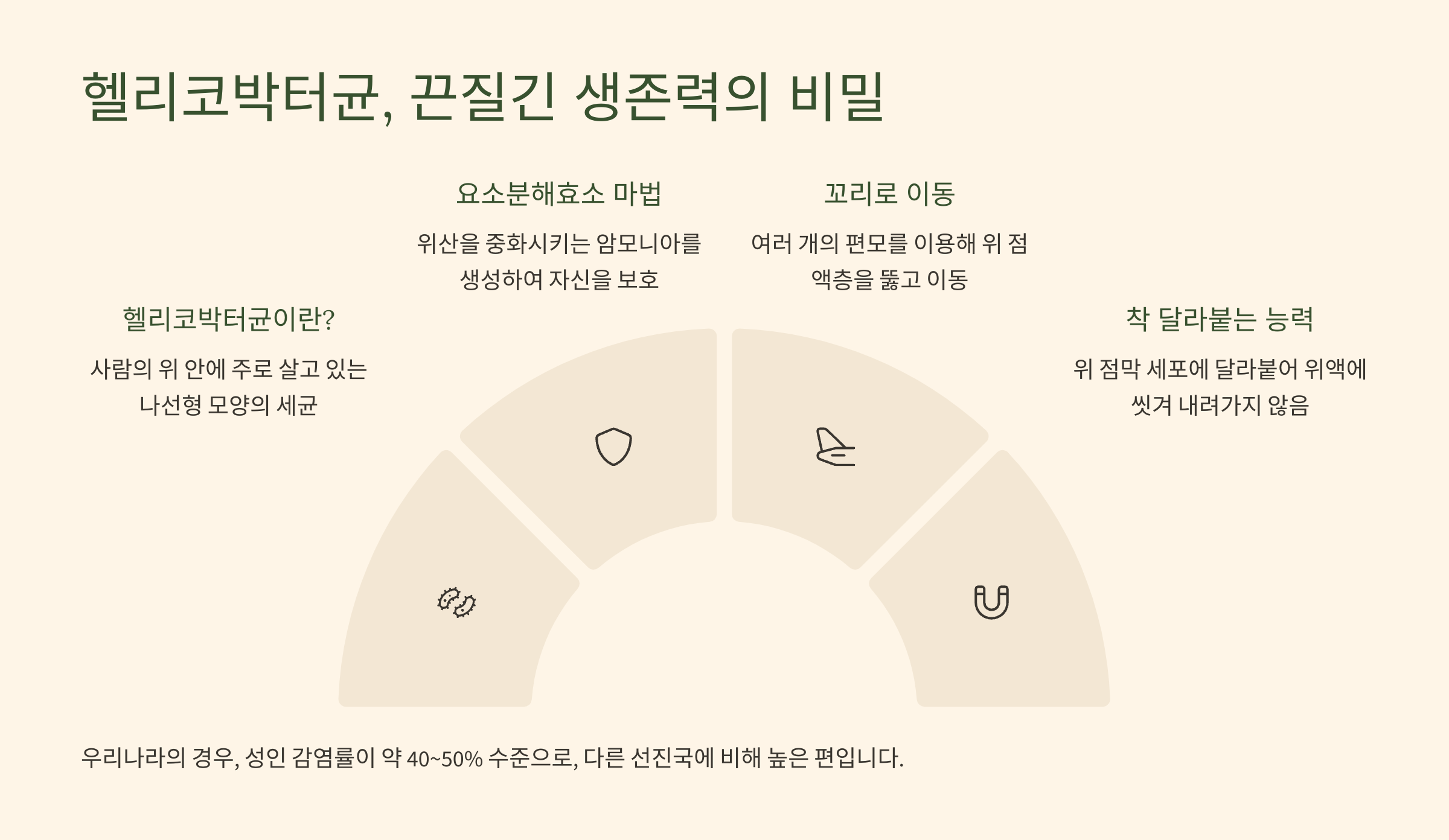 위 내부는 강력한 위산(pH 1~2) 때문에 대부분의 세균이 살기 어려운 환경입니다. 하지만 헬리코박터균은 몇 가지 특별한 능력으로 이 극한 환경을 이겨냅니다.