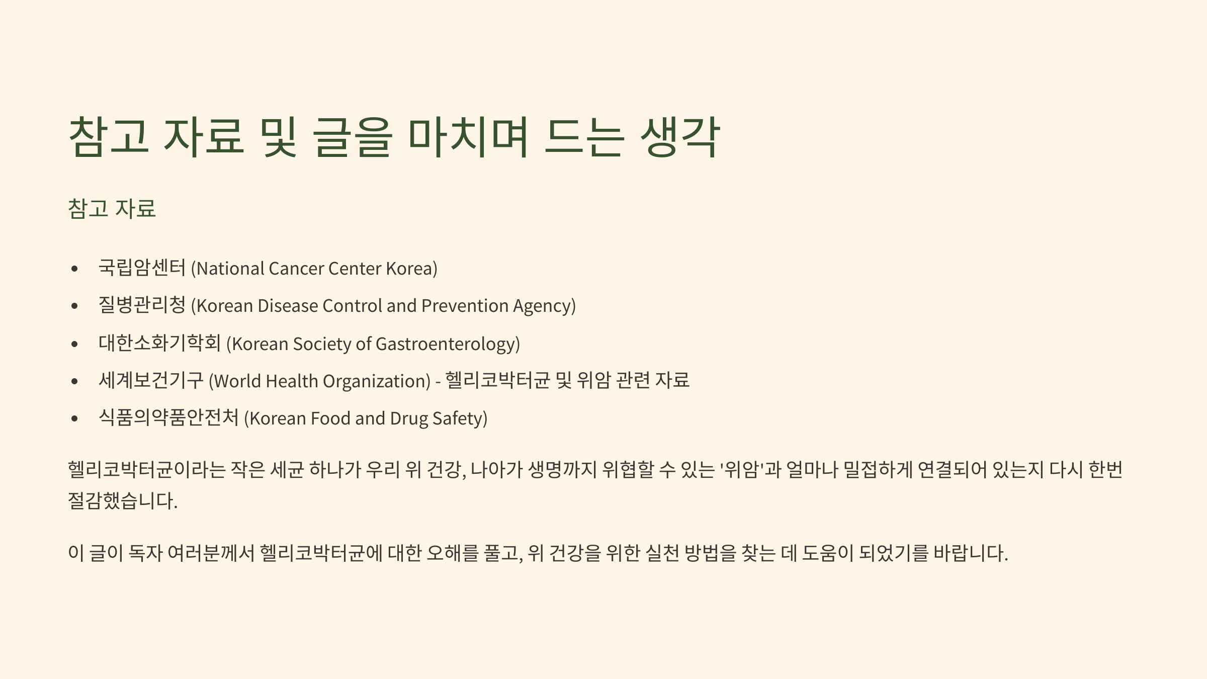 이 글을 준비하면서, 헬리코박터균이라는 작은 세균 하나가 우리 위 건강, 나아가 생명까지 위협할 수 있는 '위암'과 얼마나 밀접하게 연결되어 있는지 다시 한번 절감했습니다. 많은 분들이 막연한 불안감이나 잘못된 정보로 인해 혼란스러워하시는 것을 보며, 정확하고 신뢰할 수 있는 정보를 친근하게 전달하는 것이 얼마나 중요한지 깨달았습니다. 특히 특정 식품 광고 등으로 인한 오해를 바로잡고, 일상생활 속에서 실천할 수 있는 지혜를 나누는 것이야말로 핼시노트가 추구해야 할 가치라고 생각합니다. 이 글이 독자 여러분께서 헬리코박터균에 대한 오해를 풀고, '나와 내 가족의 위 건강을 위해 무엇을 해야 할까?'라는 질문에 대한 명쾌한 답을 찾는 데 조금이나마 도움이 되었기를 바랍니다. 건강은 지식에서 시작되어 실천으로 완성된다는 믿음으로, 앞으로도 유익한 건강 정보를 전달하기 위해 노력하겠습니다.
