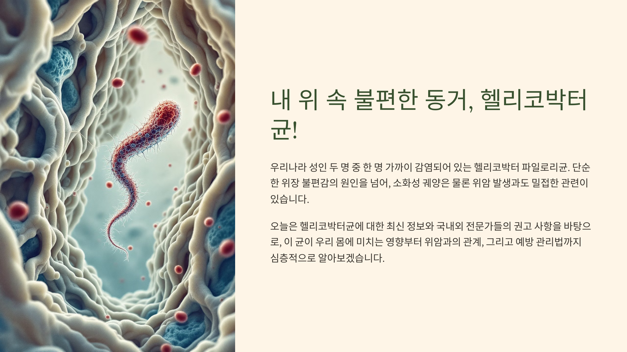 오늘 핼시노트 '건강 생활' 편에서는 단순한 정보 나열을 넘어, 헬리코박터균에 대한 최신 정보와 국내외 전문가들의 권고 사항을 바탕으로, 이 균이 우리 몸에 미치는 영향부터 위암과의 관계, 그리고 일반인들이 실생활에서 궁금해하고 실천할 수 있는 예방 관리법과 잘못된 상식을 바로잡는 데 초점을 맞추어 심층적으로 분석해 드립니다! 이 글을 통해 헬리코박터균에 대한 막연한 불안감을 해소하고, 독자 여러분의 소중한 위 건강을 지키는 데 실질적인 도움을 드리는 것을 목표로 합니다. (국립암센터, 질병관리청, 대한소화기학회, 세계보건기구(WHO) 등 국내외 공신력 있는 기관의 최신 자료 및 연구 발표를 참고했습니다.)