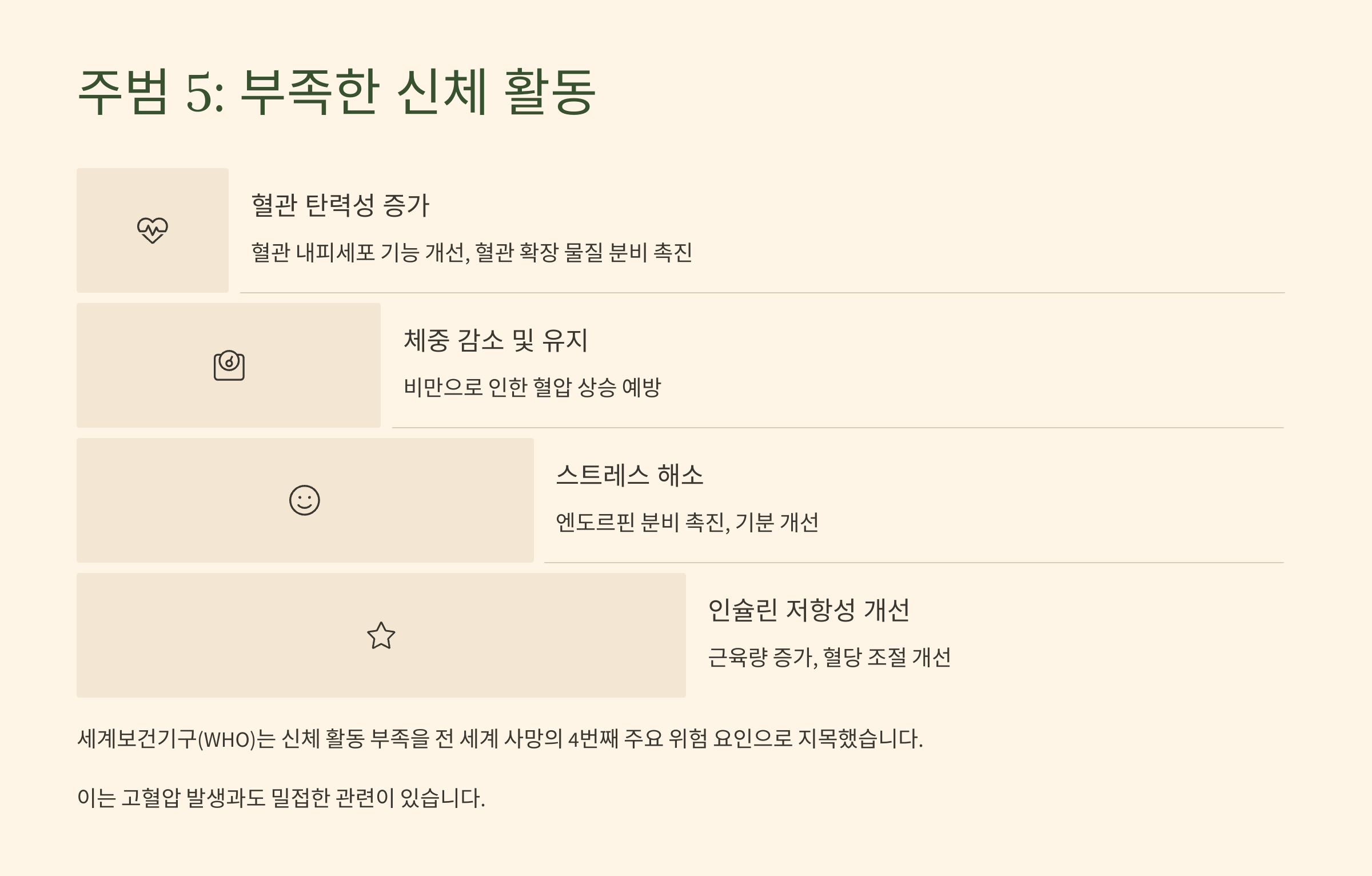 - (5) 주범 5: 부족한 '신체 활동' (움직임 없는 현대 사회의 비극)